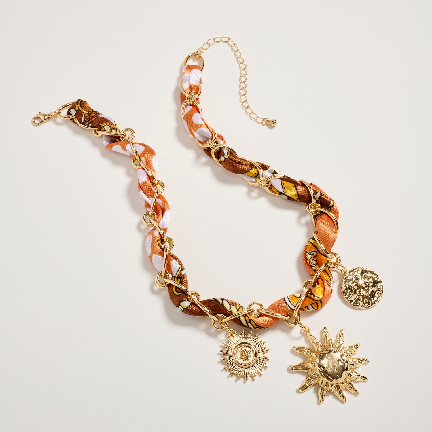 Bold and radiant, this gold sun charm scarf necklace blends warm earthy tones with eye-catching celestial details. Featuring a silky brown patterned scarf woven through gold-tone chain links and finished with textured sun and coin charms, this statement necklace adds a luxe bohemian touch to any outfit.