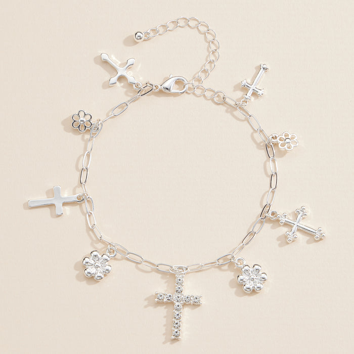 Gold and Silver Charm Bracelet with Different Style Cross and Floral Pendants – Fashion Jewelry