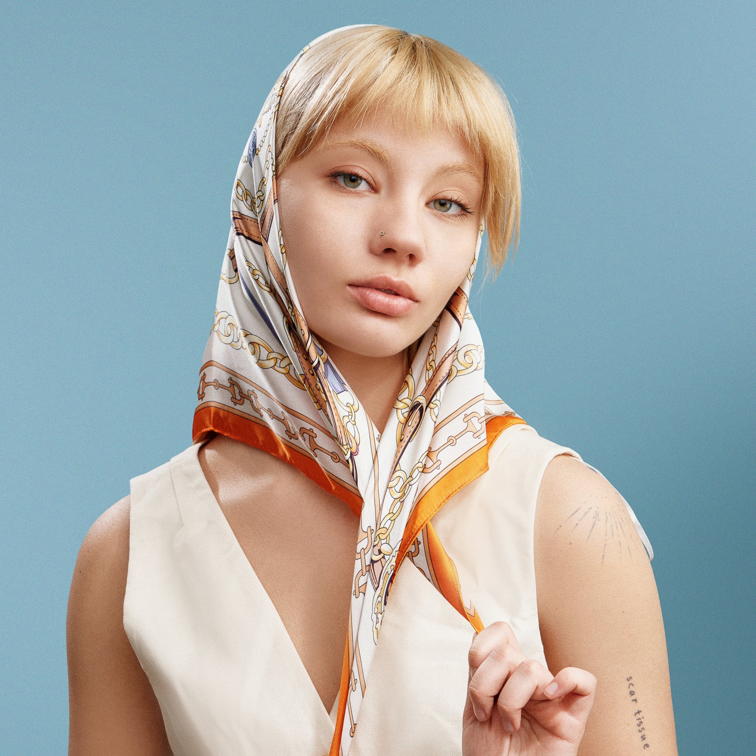 This elegant square scarf features a timeless equestrian-inspired design with intertwined belts, buckles, and gold chains arranged in a symmetrical pattern. Available in rich black, soft ivory, and ivory with a bold orange border, this scarf adds a polished, vintage-luxury touch to any outfit. Perfect for wearing around the neck, as a headscarf, or styled on a handbag for effortless sophistication.