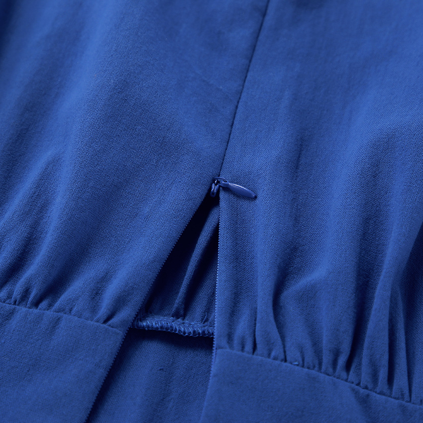 French Vacation Blue Cotton-Linen V-Neck Backless Dress