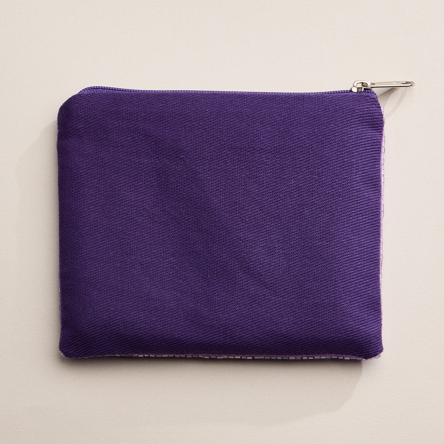 Hand-beaded design with spiders, web, witch hat, and Boo text. Rich purple background with shimmering beadwork. Durable fabric with smooth zipper closure. Compact size ideal for cards, coins, cosmetics, or small essentials.