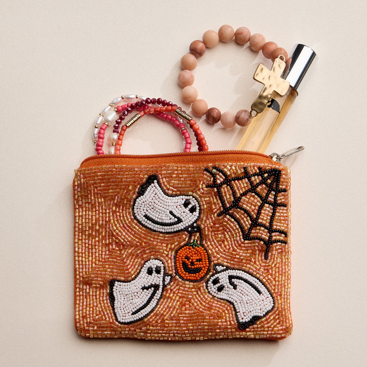 Get into the spooky spirit with this beaded Halloween zipper pouch featuring playful white ghosts, a smiling pumpkin, and a spider web on a vibrant orange background. Carefully hand-beaded for a fun and festive look, this pouch is perfect for storing small accessories, cards, coins, or makeup. The secure zipper closure keeps your items safe while adding a touch of Halloween fun to your everyday essentials.