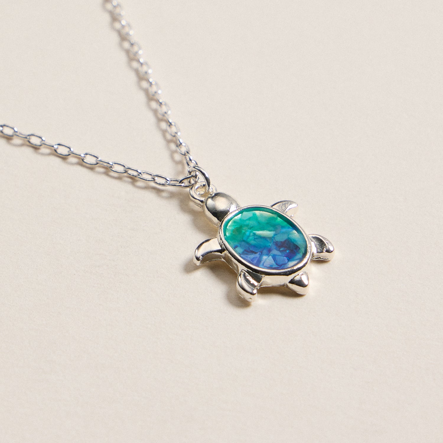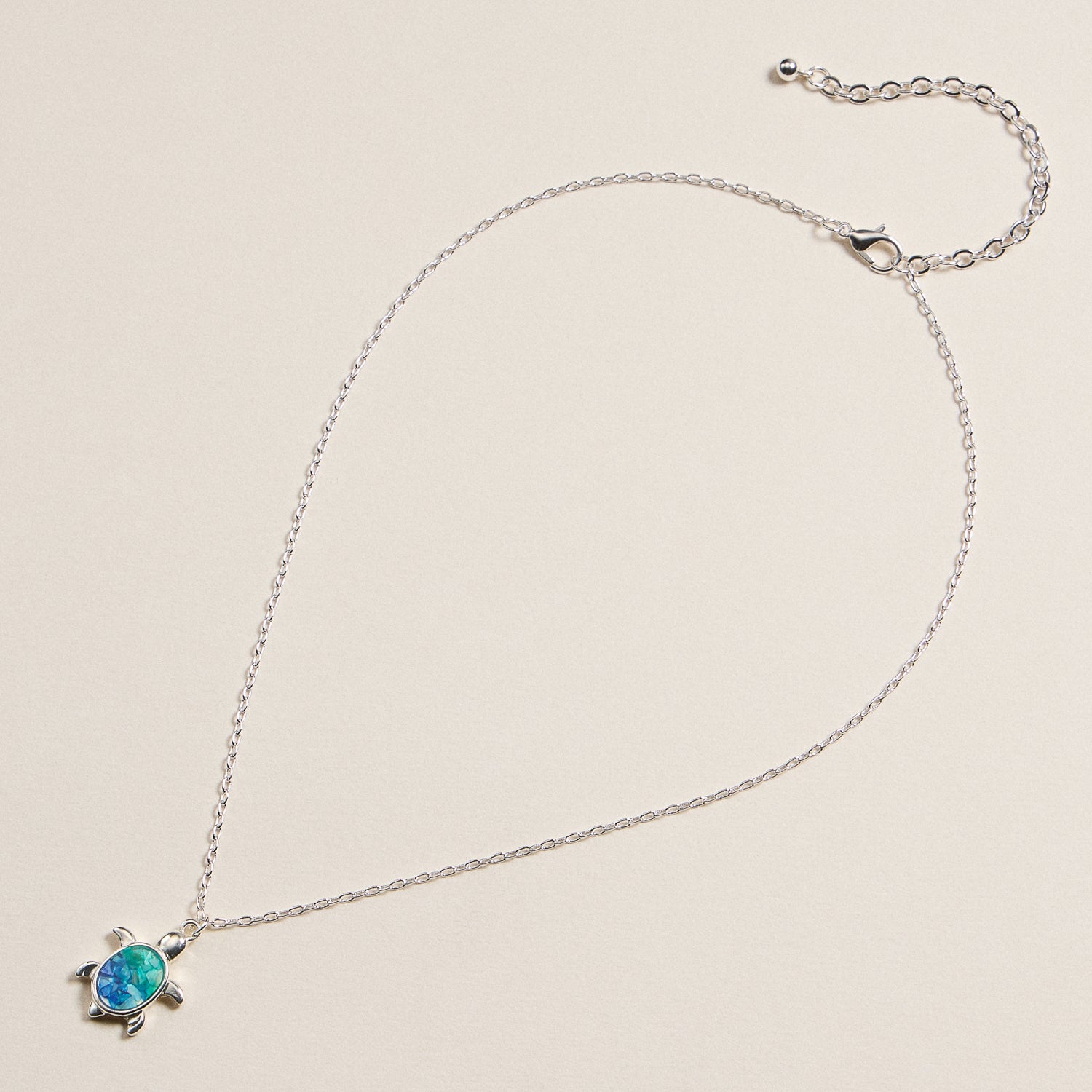 Embrace coastal charm with this 17 inch Turtle Enamel Pendant Necklace. Featuring a silver-tone sea turtle with a vibrant blue-green enamel shell, this necklace adds a playful ocean vibe to any look. Perfect for beach lovers, it offers lightweight comfort and stylish simplicity.