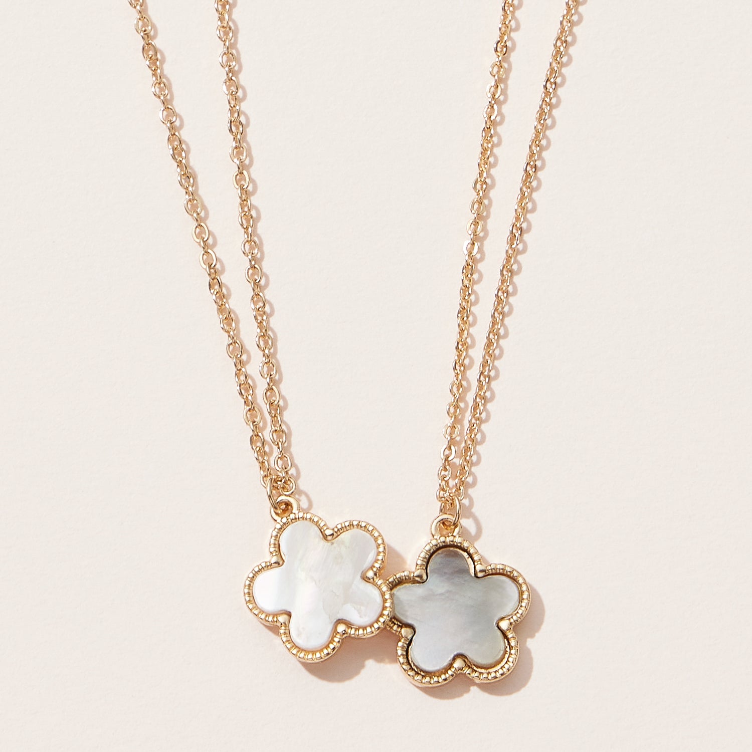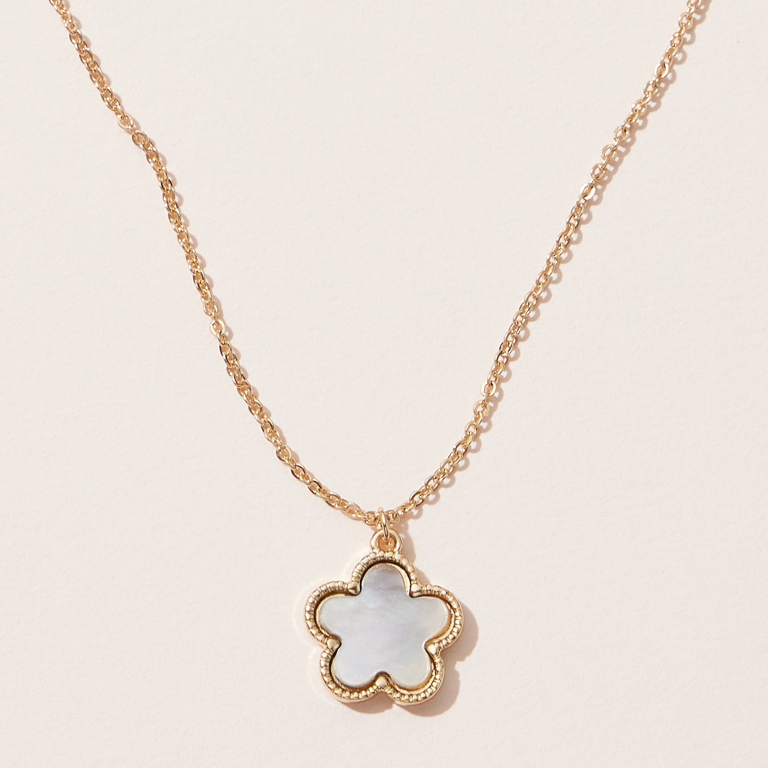This necklace features a clover design made of mother of pearl, creating a classic and elegant look.