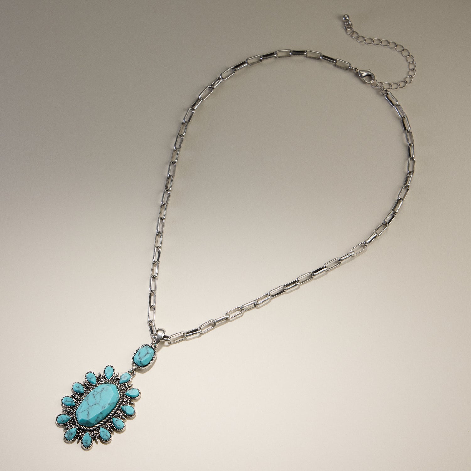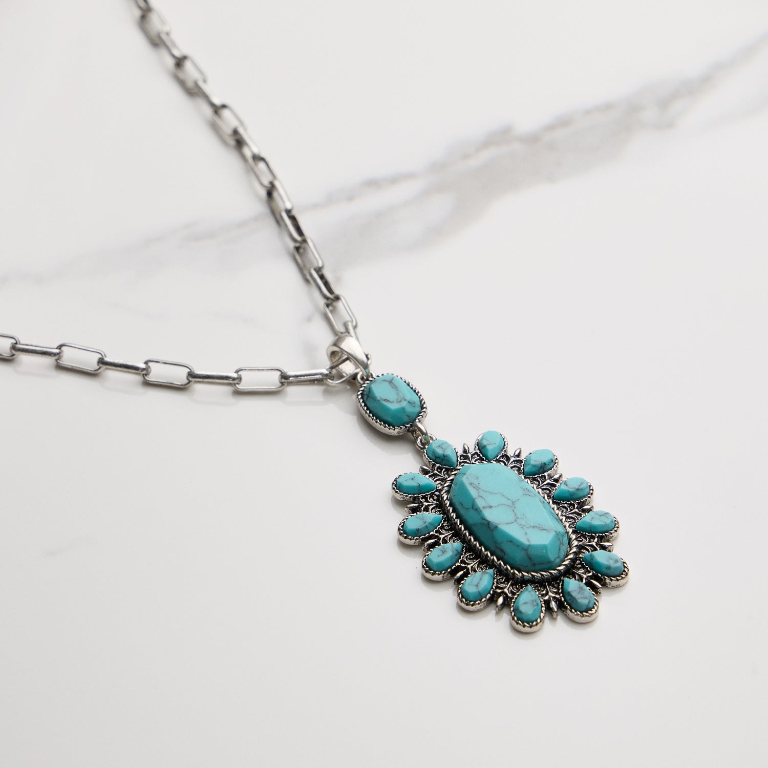 This floral-inspired necklace features a stunning semi-precious natural turquoise center stone surrounded by petal-shaped accents in a silver-tone setting. Hanging from a bold rectangular link chain, this statement piece blends boho charm with Western elegance. Adjustable and eye-catching, it’s perfect for dressing up or adding flair to everyday looks.