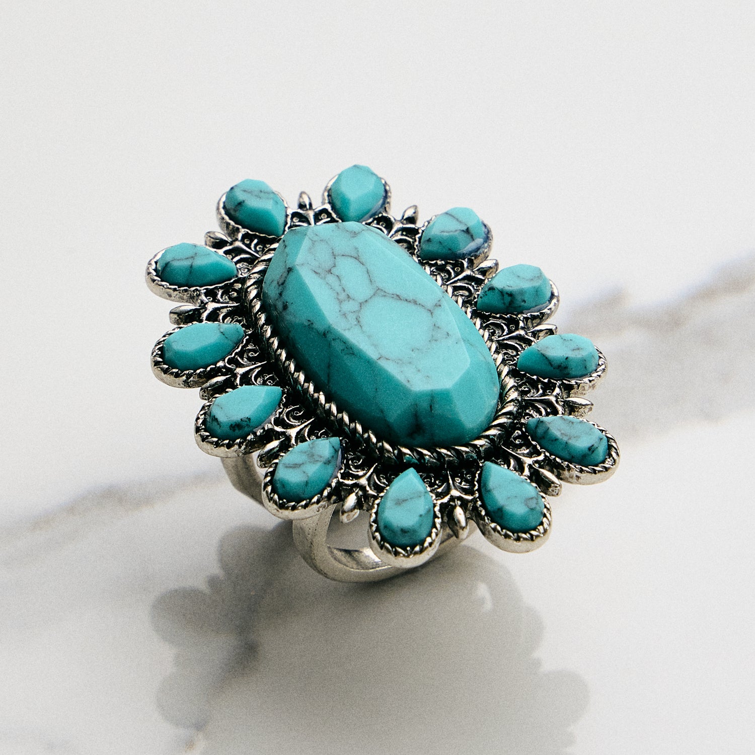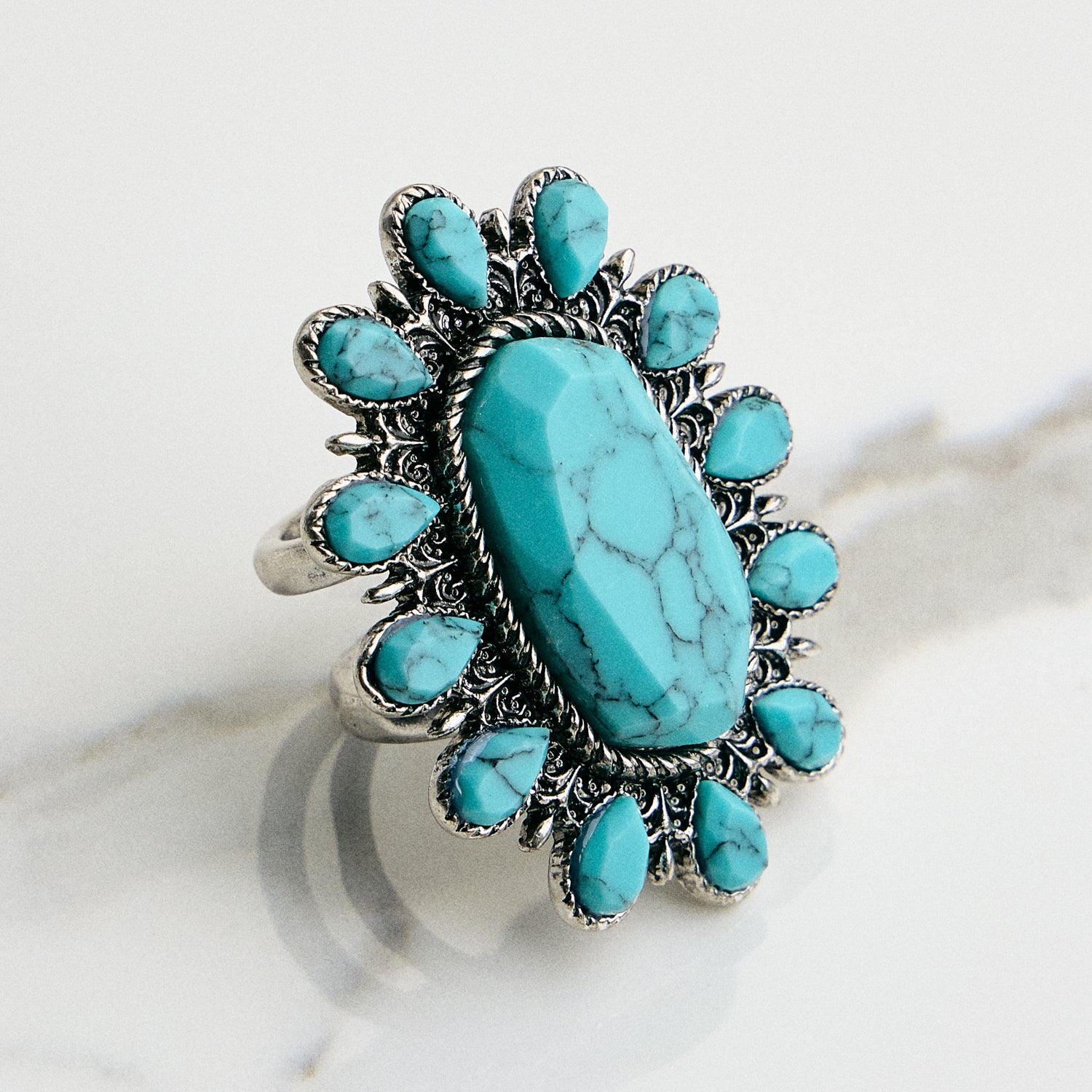 This bold floral ring features a semi-precious natural turquoise center stone surrounded by petal-shaped turquoise accents. Set in an ornate silver-tone frame, the design channels vintage Western flair with a boho twist. Eye-catching and full of detail, it’s the perfect accessory to elevate any look.