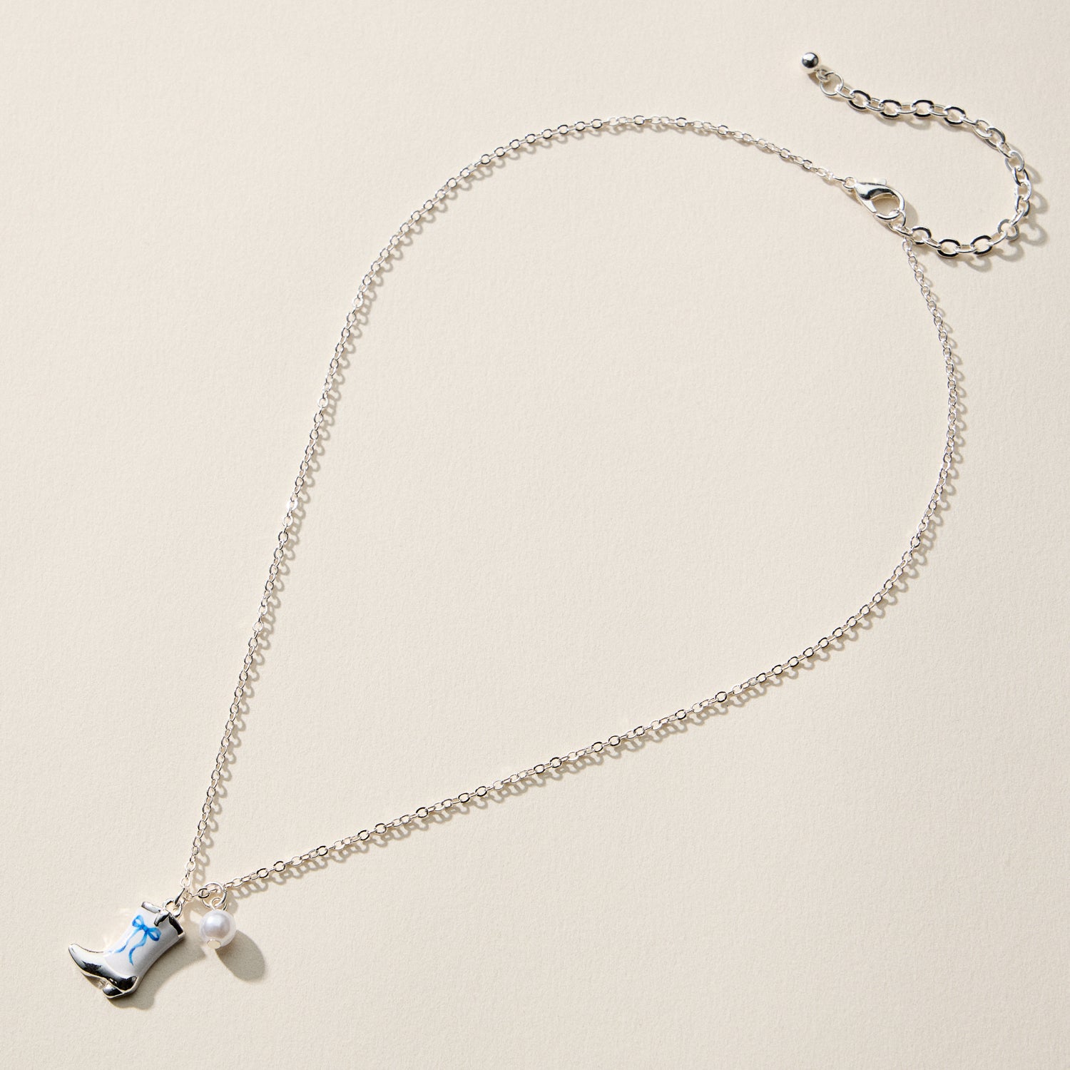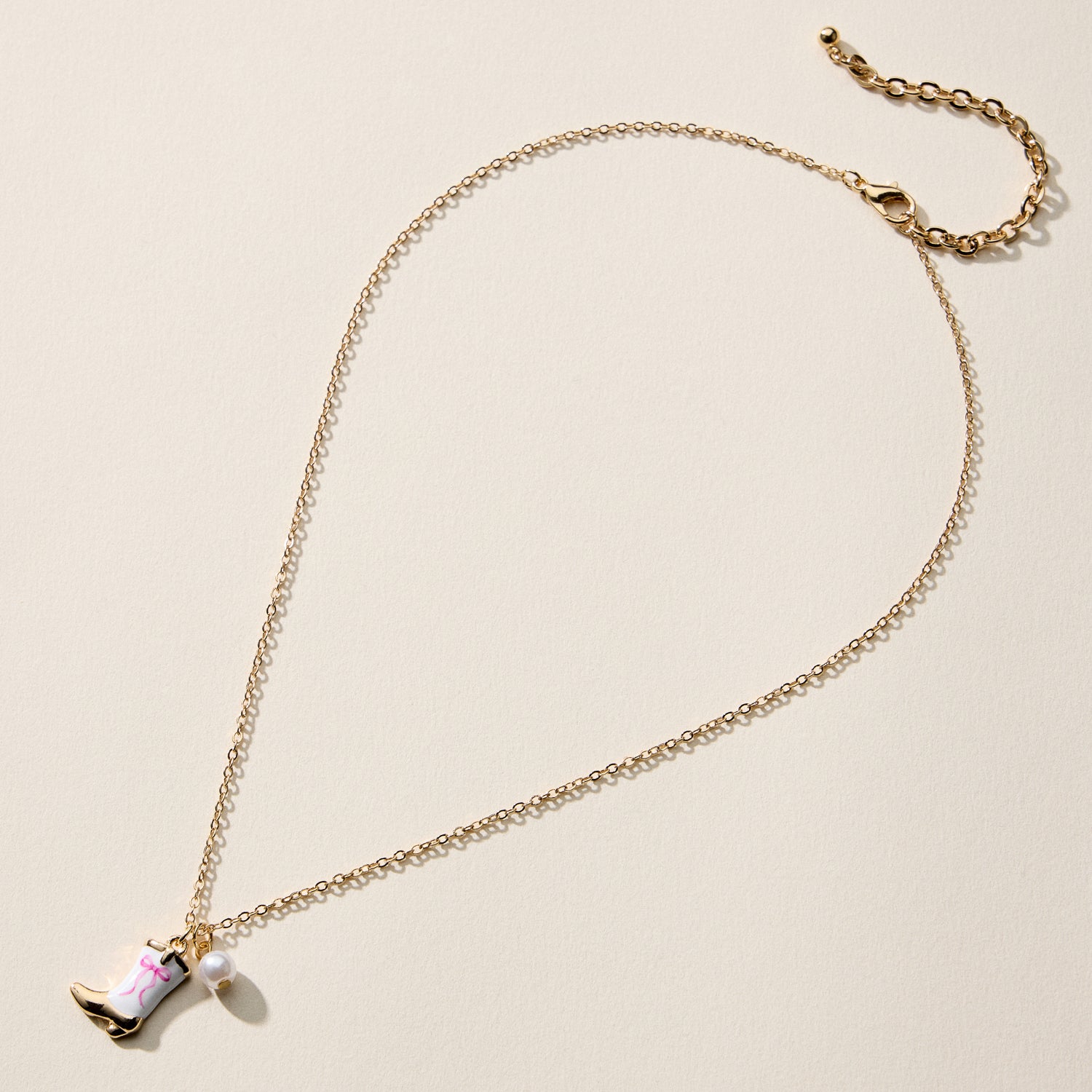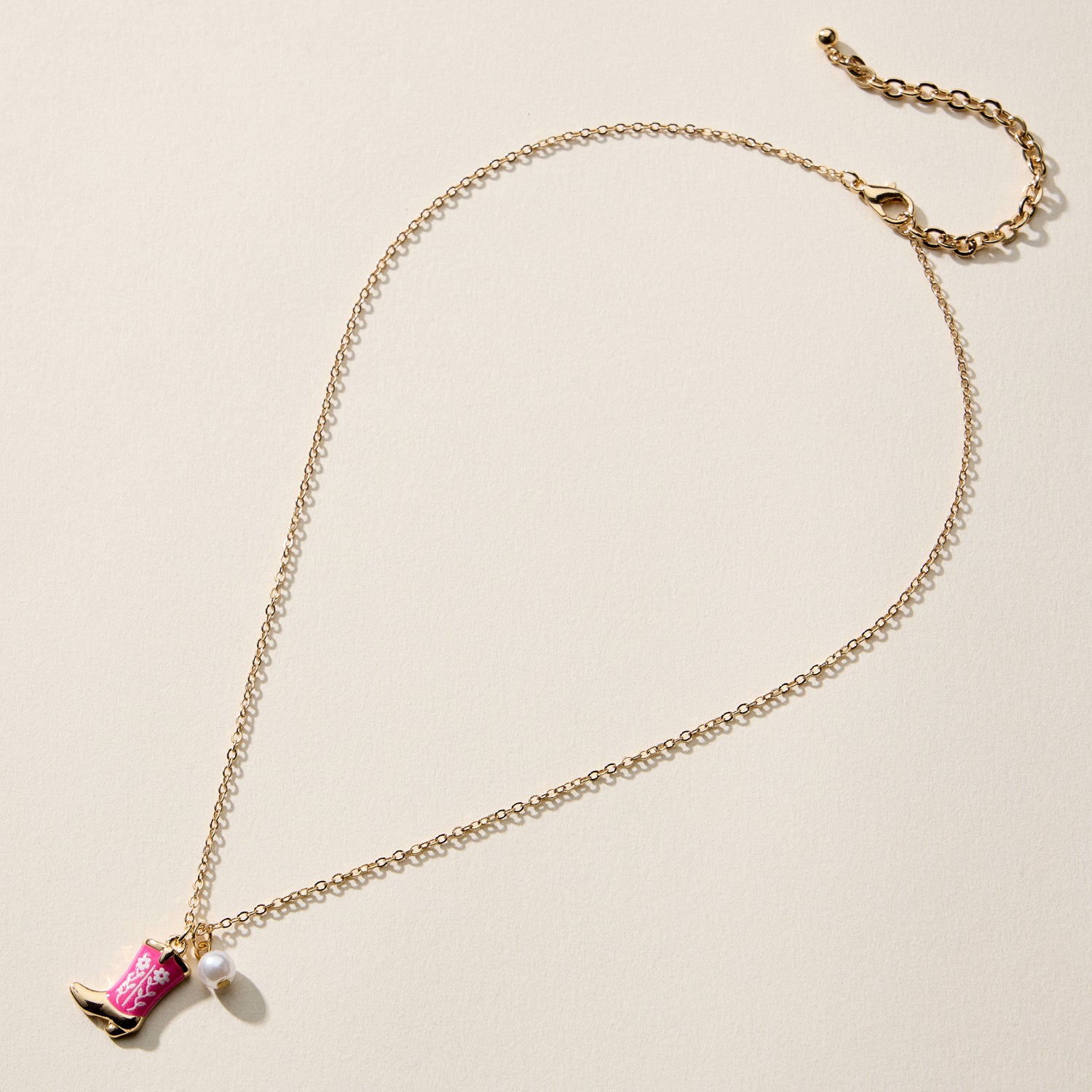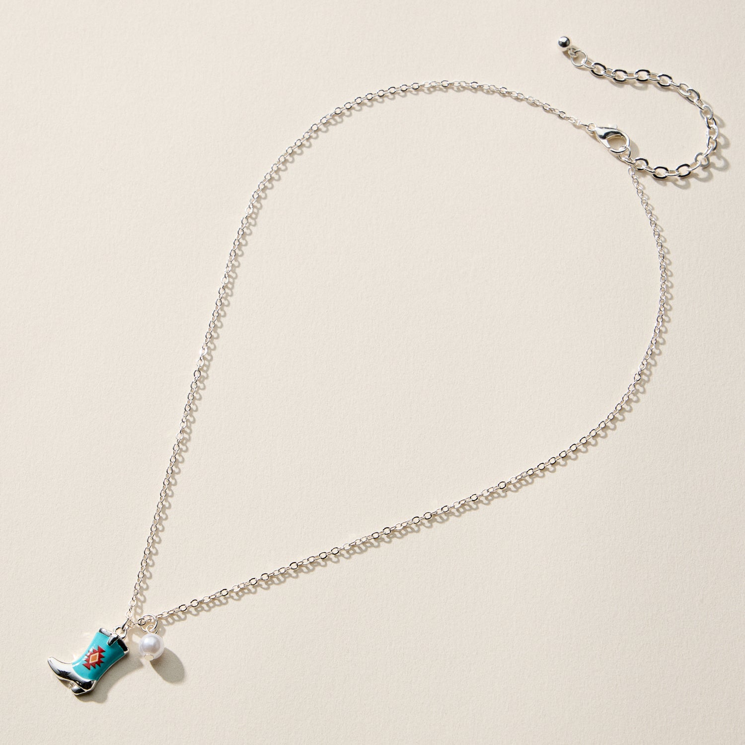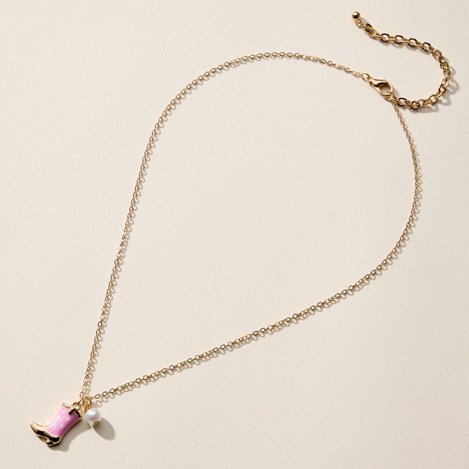 Featuring a glossy enamel cowboy boot pendant with printed graphic details, this short necklace is finished with a delicate faux pearl accent and a fine metal chain. The mix of western iconography and feminine details creates a fun, easy-to-wear piece that works well layered or worn on its own.