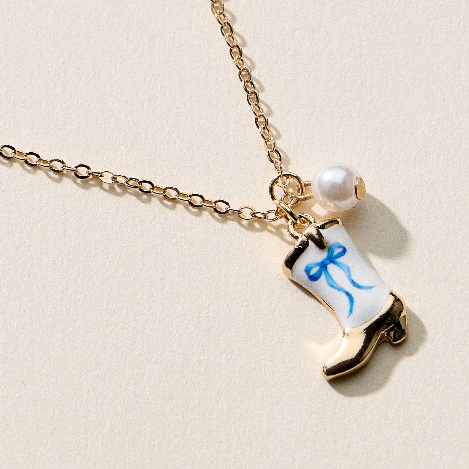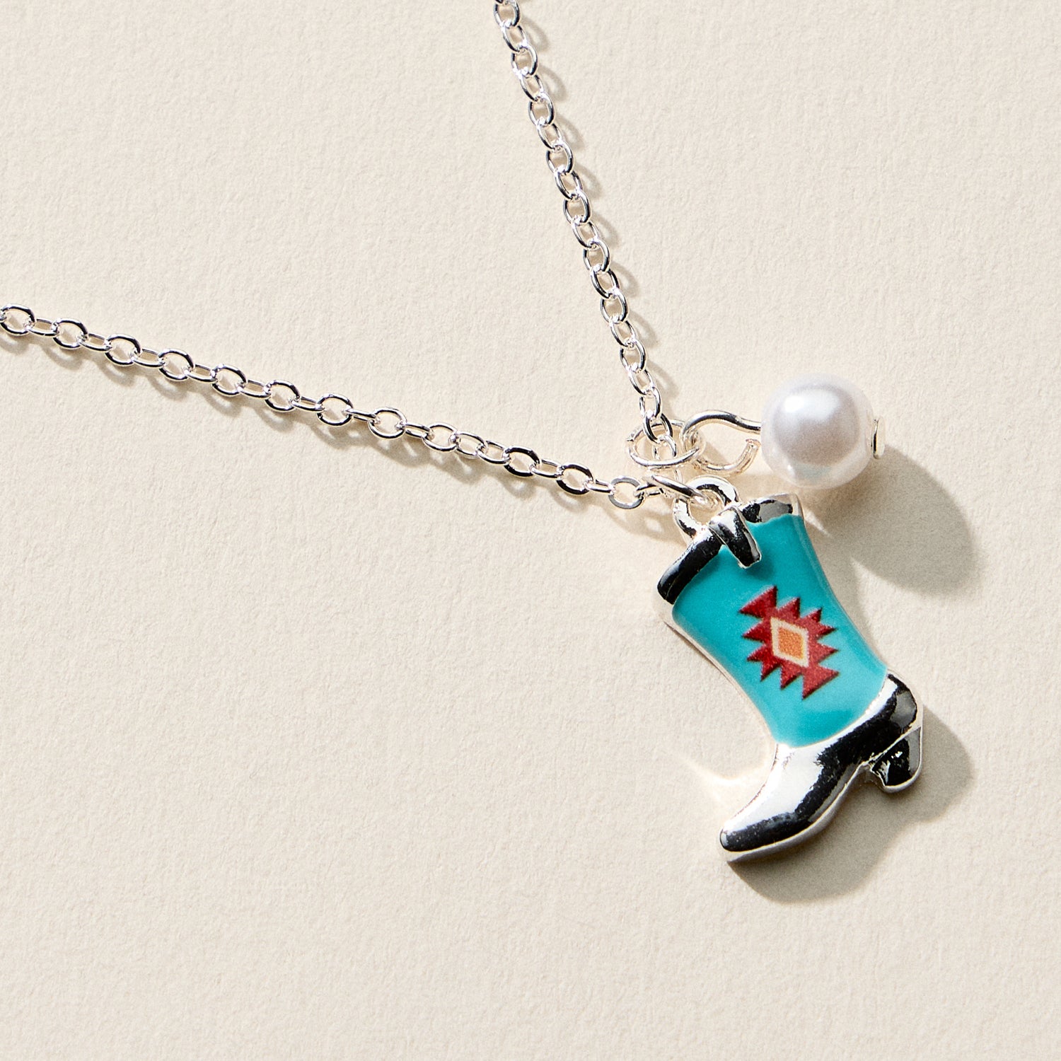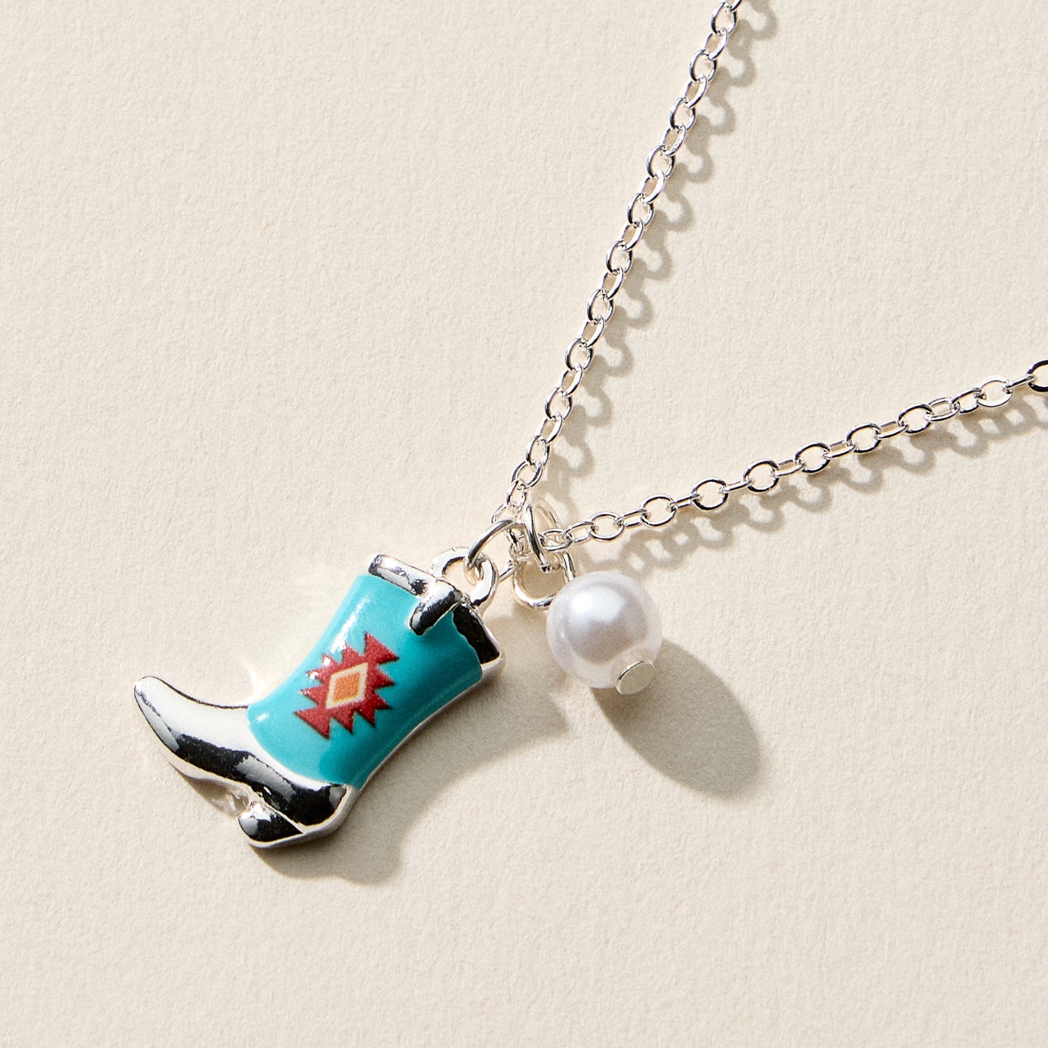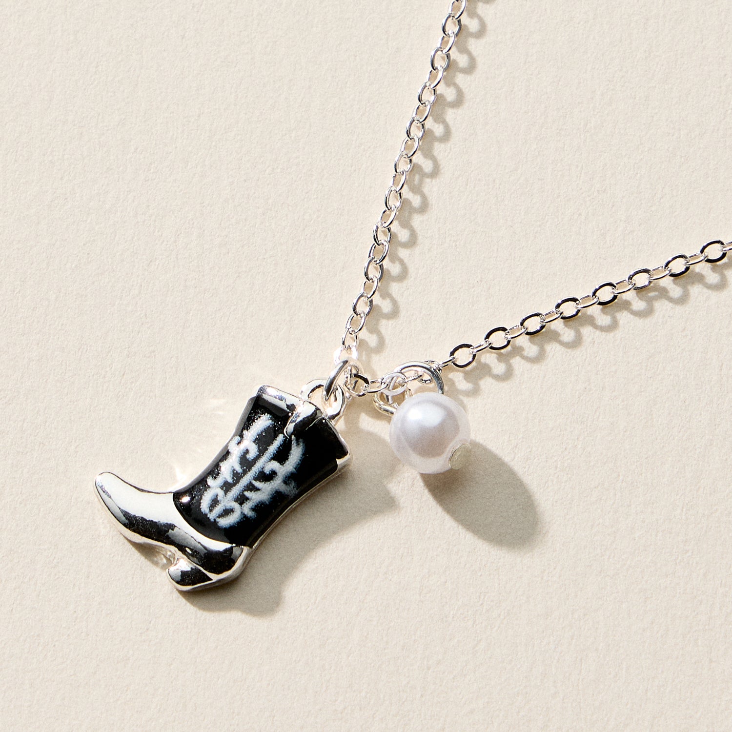 Boot Enamel Necklace – Cowboy Boot Pendant with Printed Detail & Pearl Accent