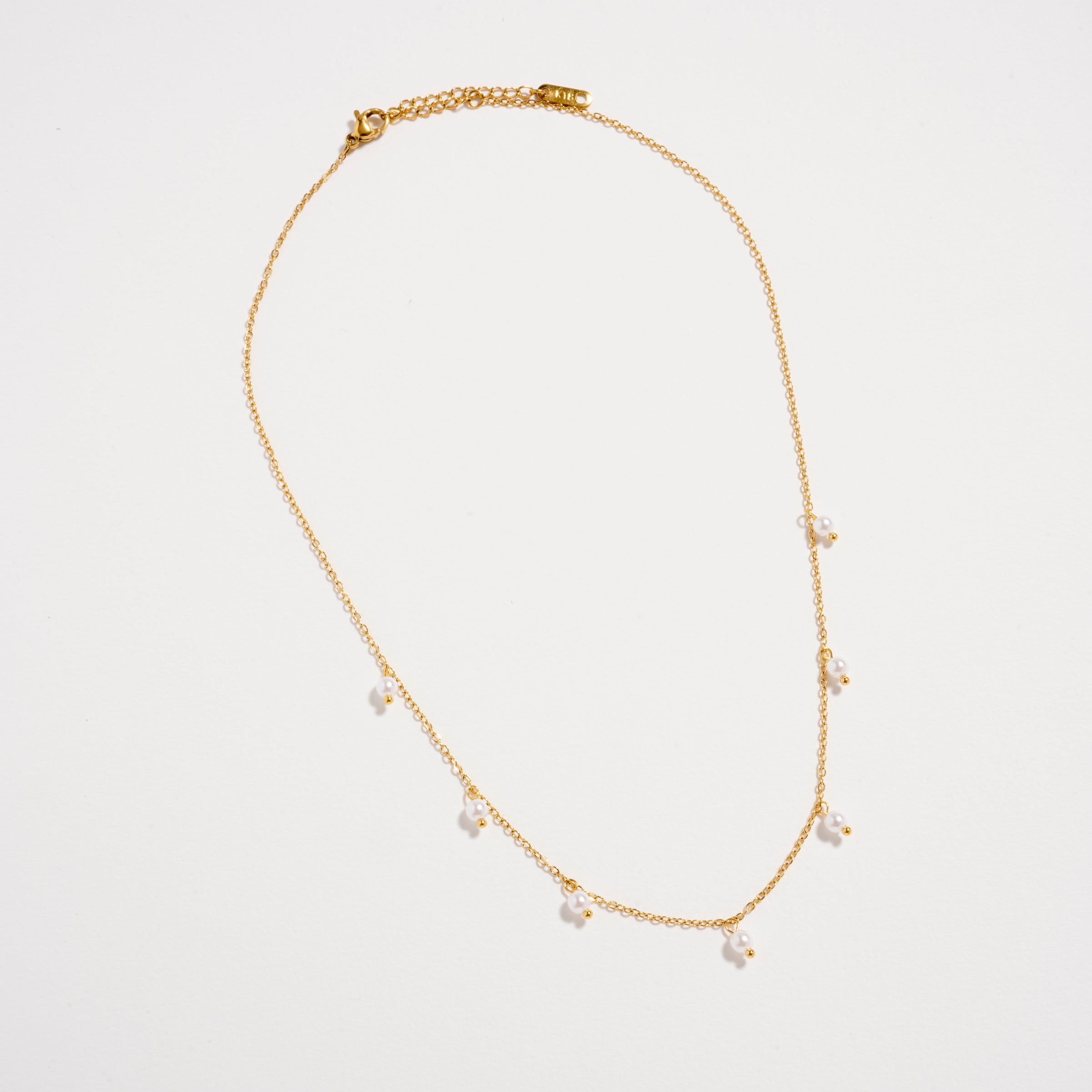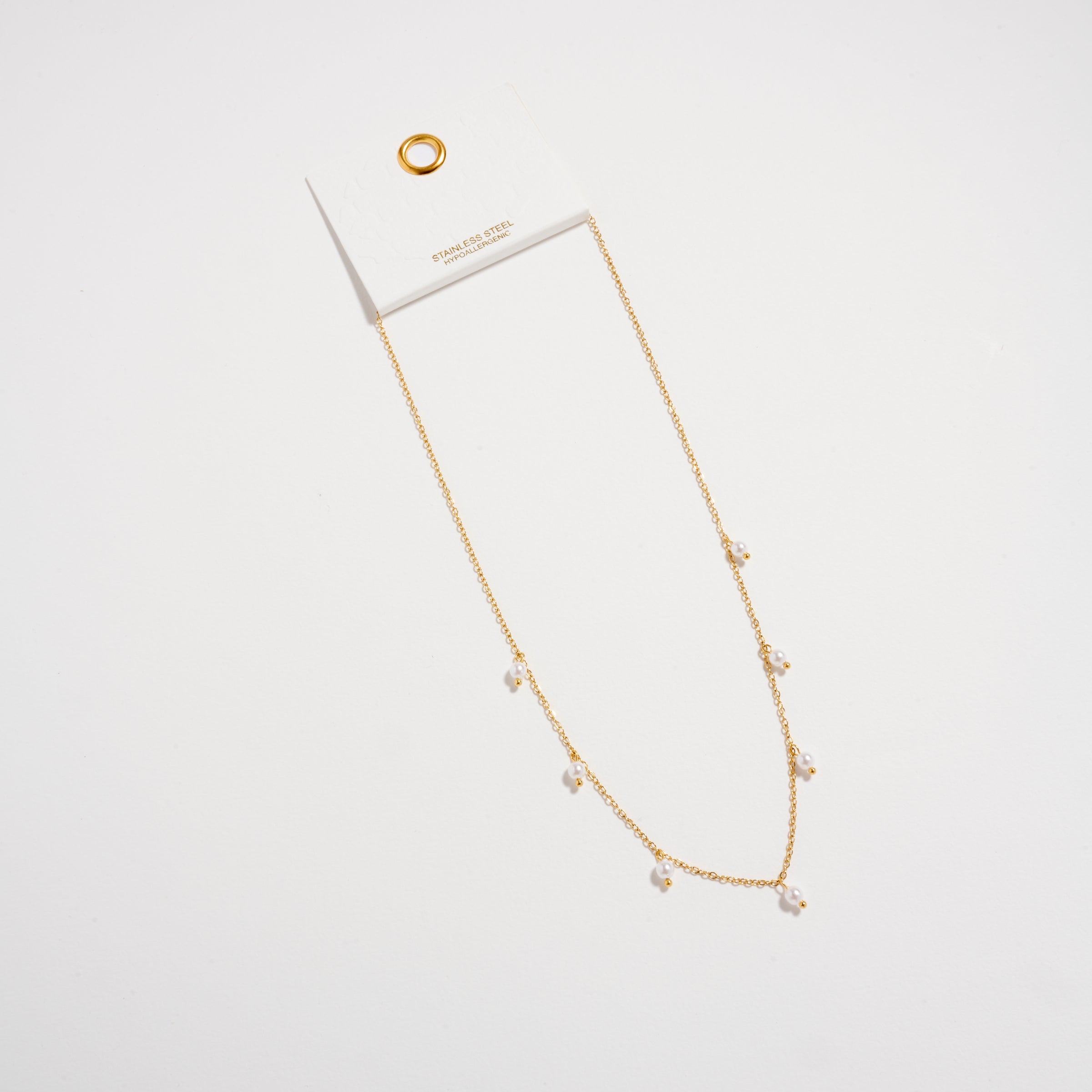 Grace your neckline with timeless elegance in this Stainless Steel Dainty Pearl Drop Necklace. Featuring petite pearl charms delicately spaced along a fine gold-tone chain, this piece brings effortless sophistication to any look. Crafted from hypoallergenic stainless steel, it’s lightweight, water-resistant, and tarnish-free—perfect for layering or wearing solo for a refined touch.