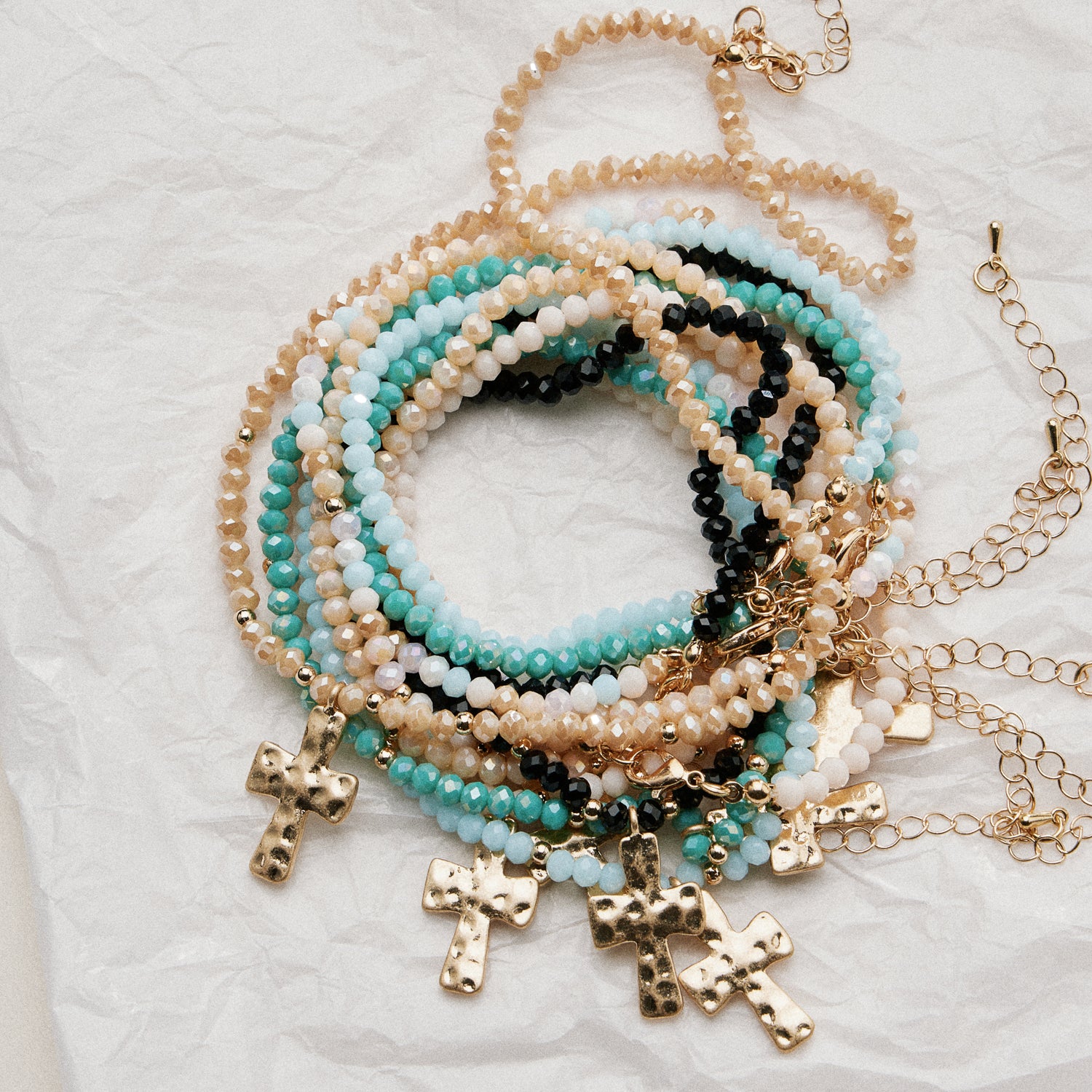 Add meaningful style to your everyday look with this elegant beaded cross necklace. Featuring faceted beads accented with gold-tone details and a textured hammered cross pendant, this necklace blends faith-inspired symbolism with modern, boho elegance. Designed to be worn alone or layered, it’s a timeless accessory with heartfelt appeal.