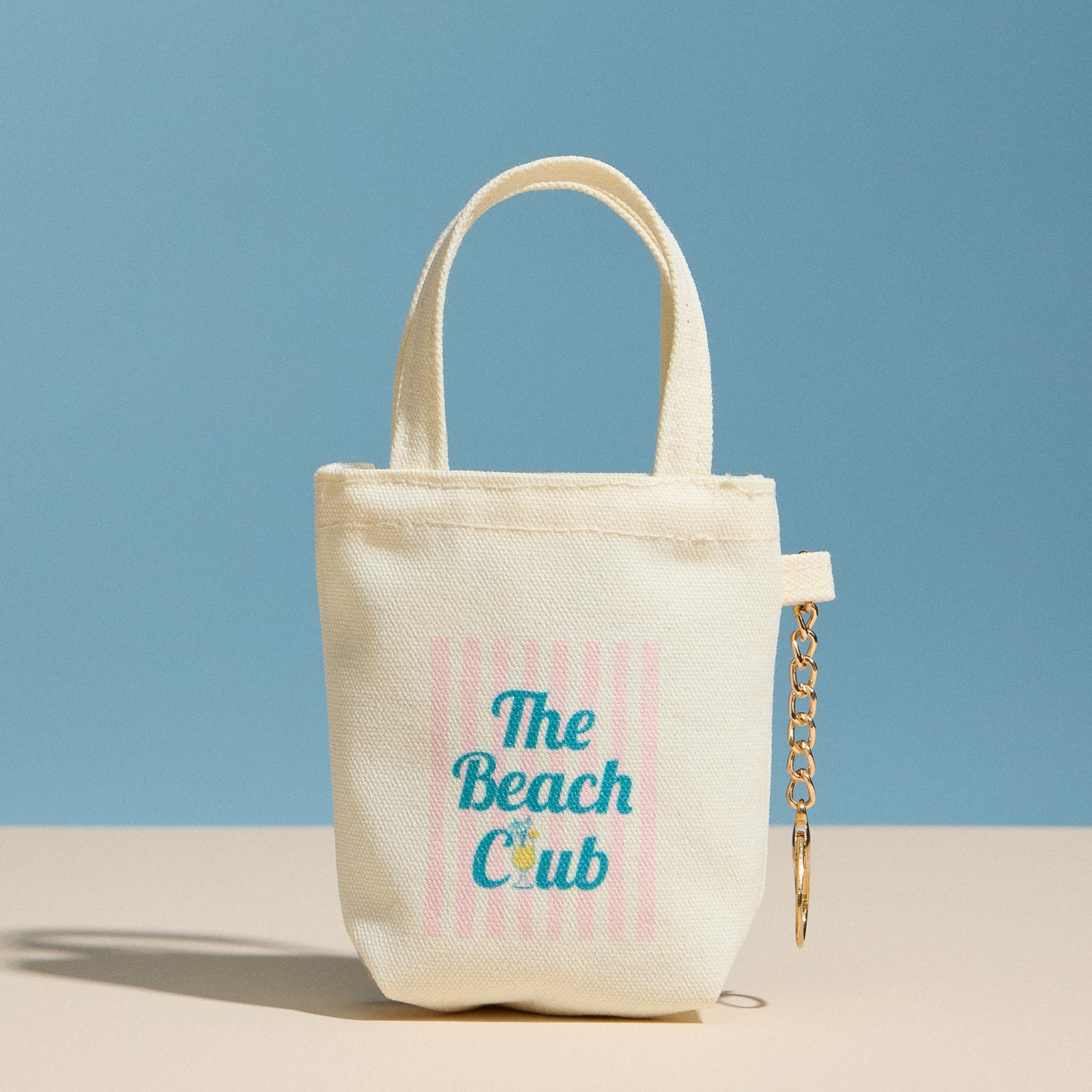 A charming mini canvas pouch featuring a soft pastel, beach-inspired graphic with a retro beach club–style feel. Designed for small everyday essentials, this compact pouch includes a sturdy short handle and an attached chain keyring for easy carrying. Lightweight yet durable, it’s perfect as a giftable add-on or a playful everyday accessory.