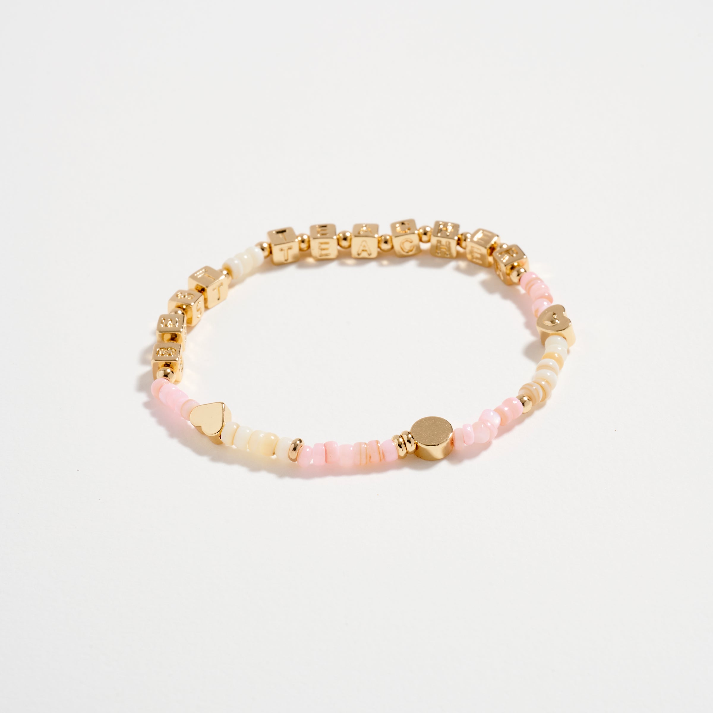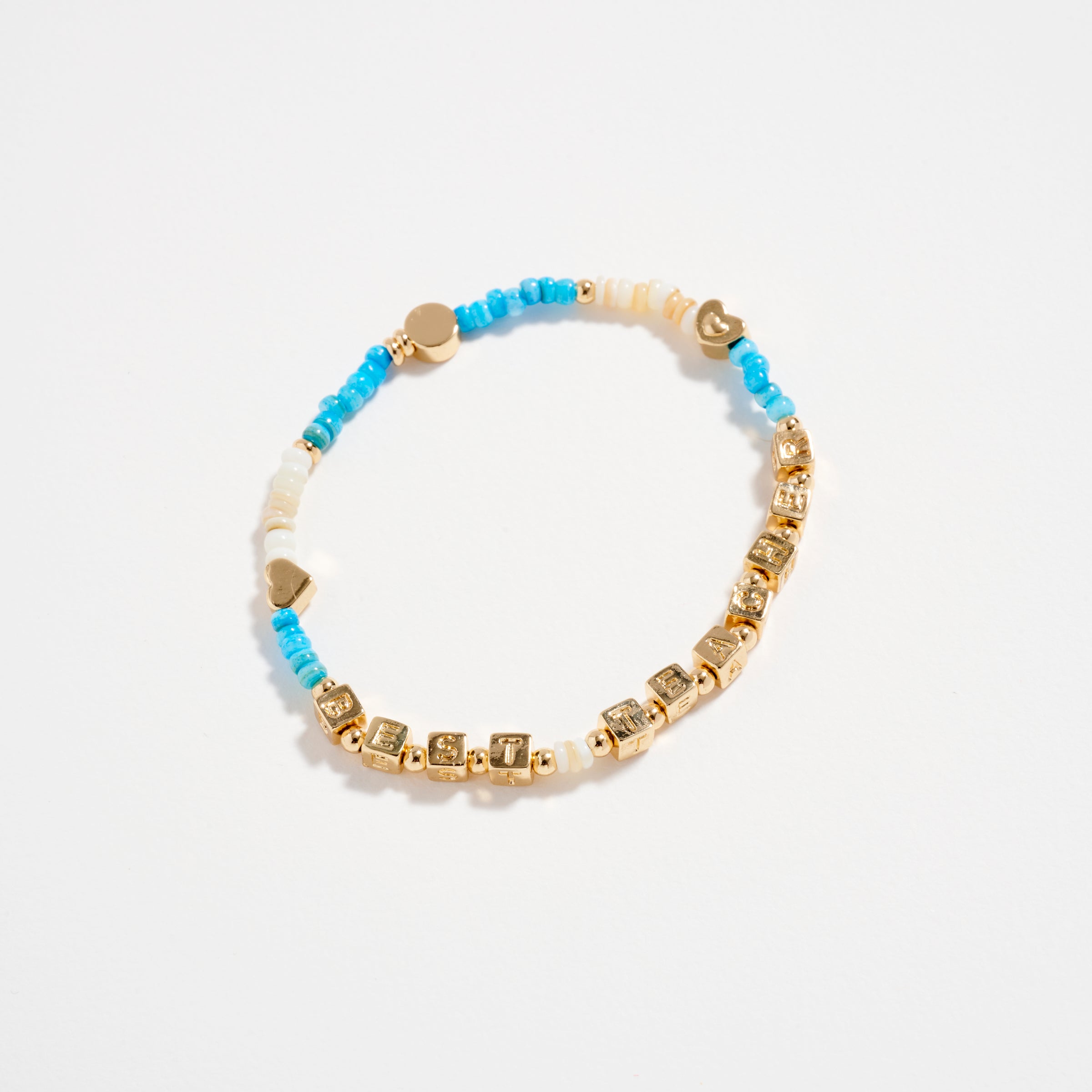 Gold Dipped Beaded “Best Teacher” Bracelet with Gold Letter Cubes & Heart Accents – Appreciation Stretch Bracelet