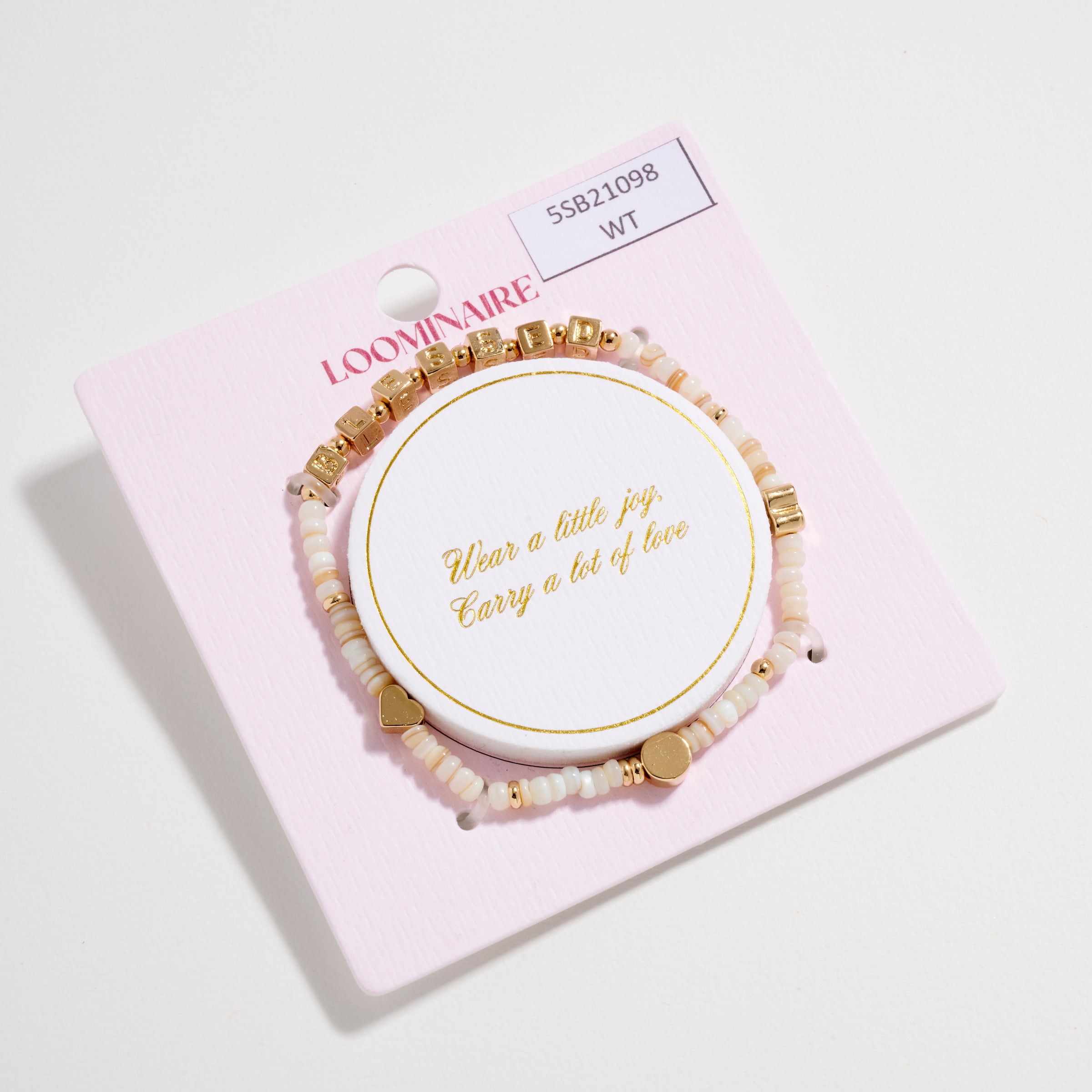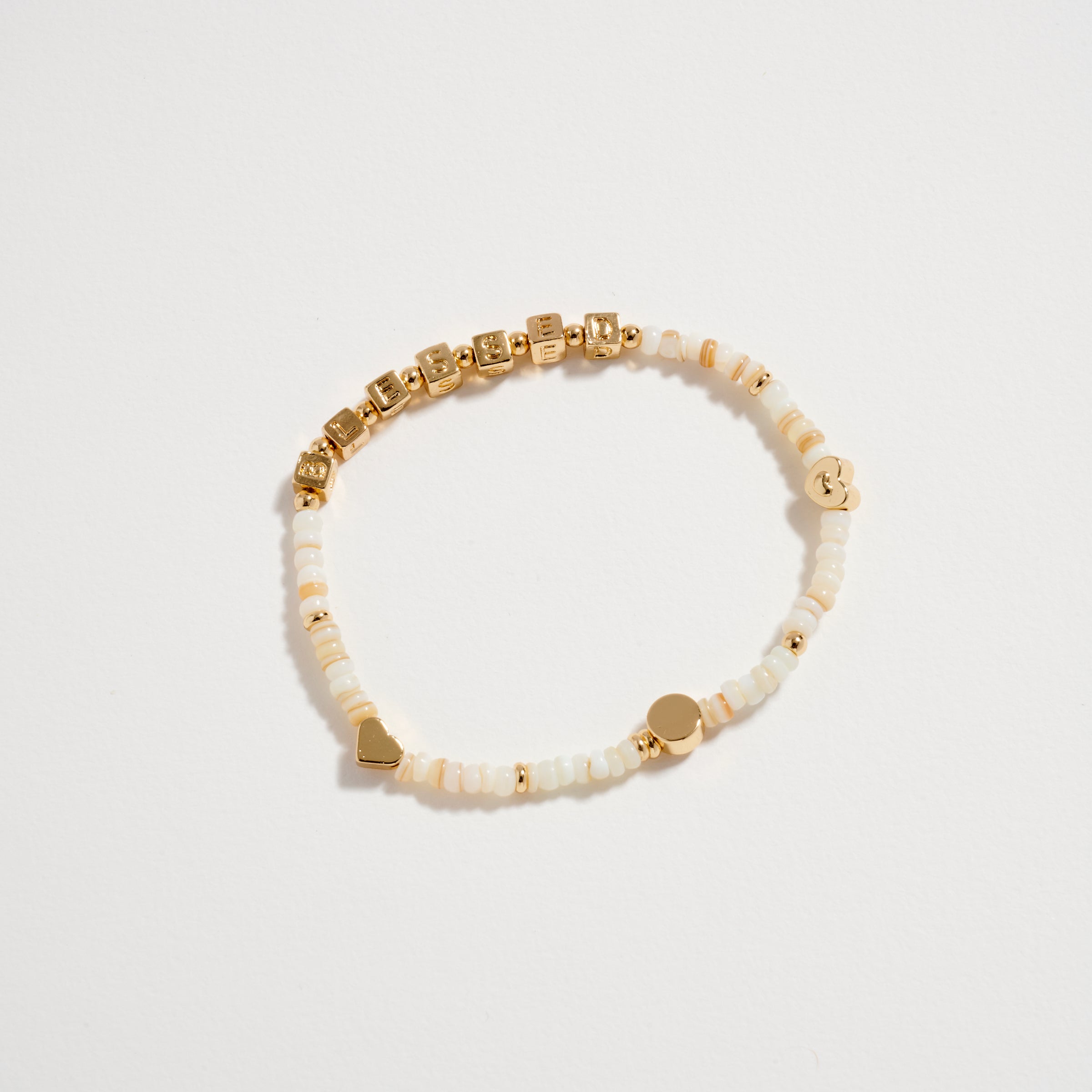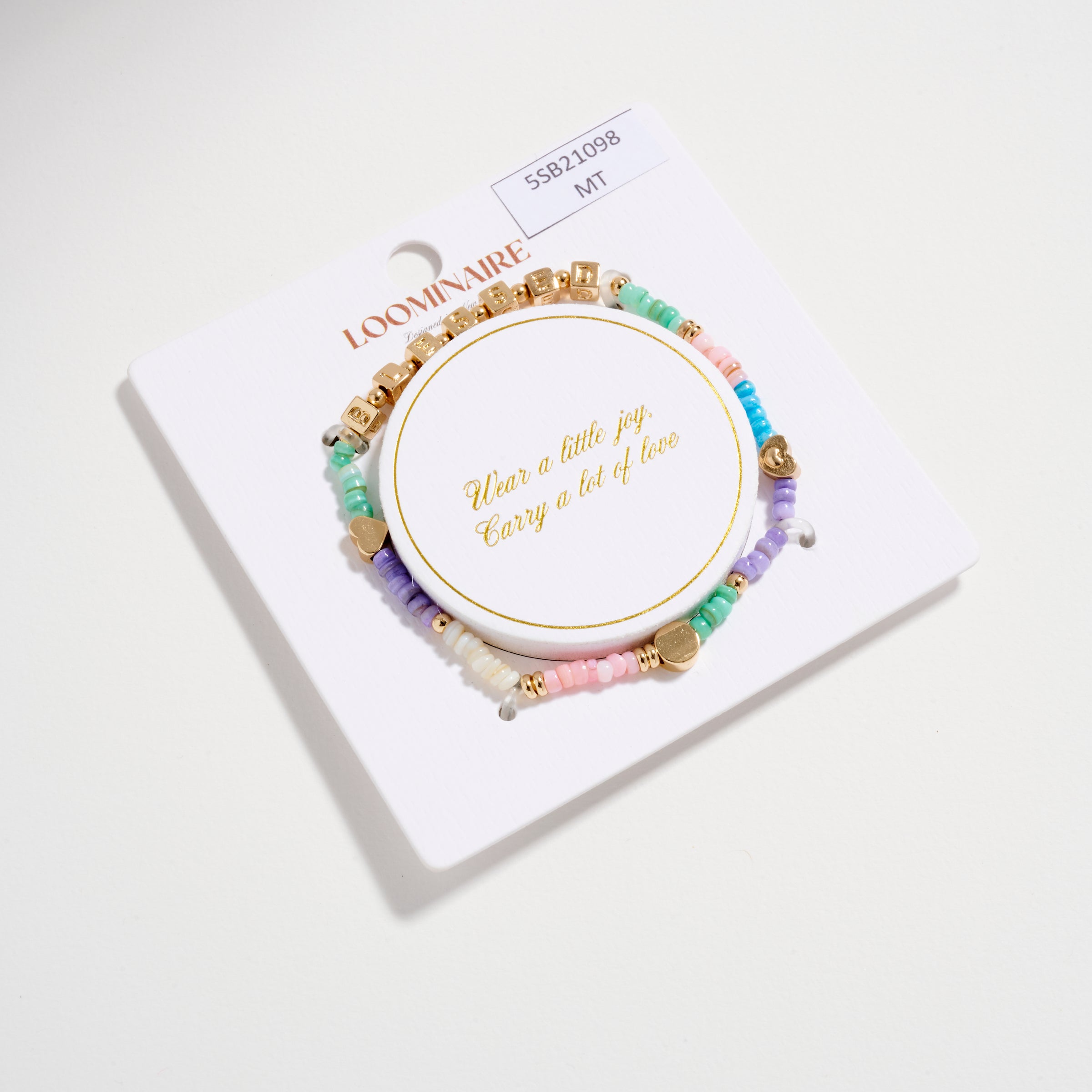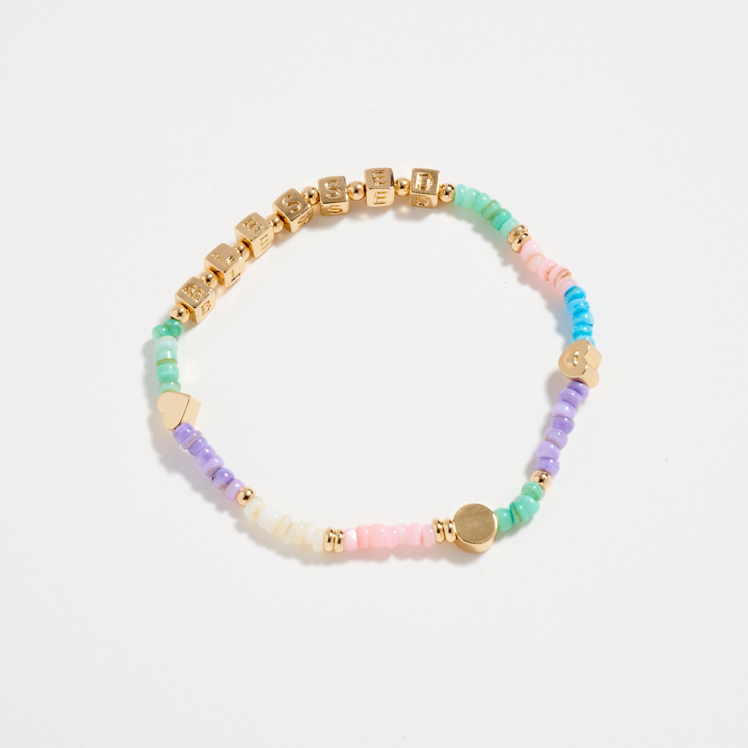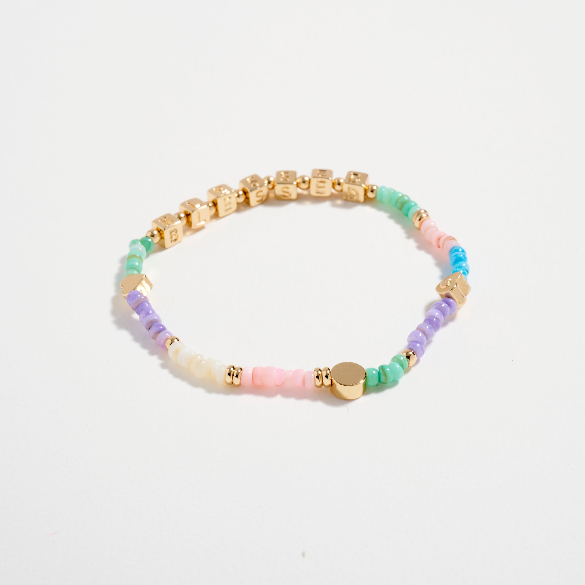 Carry positivity wherever you go with this uplifting “Blessed” bracelet. Made with soft pastel glass beads and polished gold-tone letter cubes, it adds a joyful touch to any look. Heart and round accents bring an extra bit of shine, and the stretch band makes it easy and comfortable to wear all day.