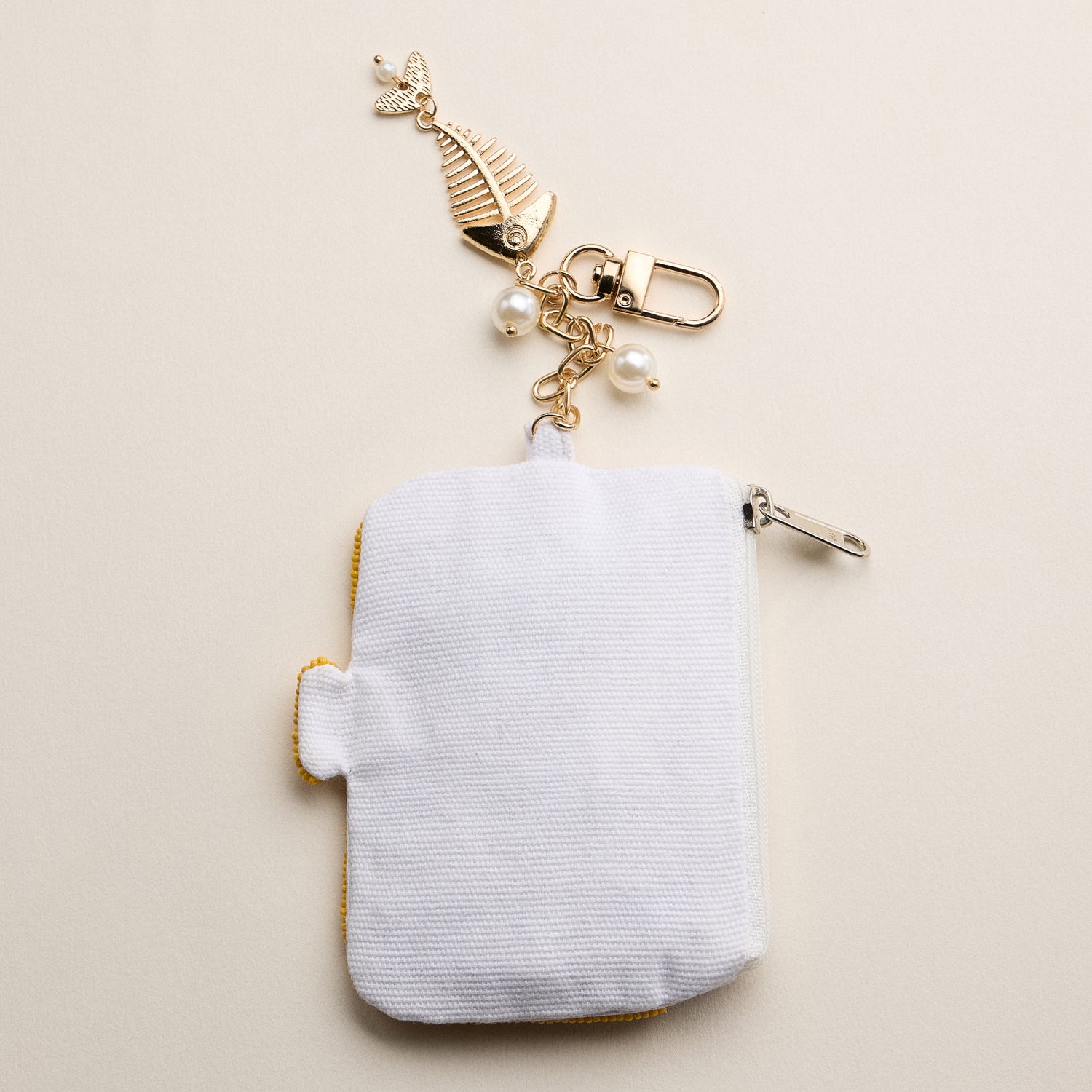 Add a fun, quirky touch to your accessories with this beaded sardine coin purse keychain. Designed with vibrant hand-beaded detailing on the front and a soft fabric back, this mini pouch brings playful character to your everyday essentials. It features a secure zipper closure and a decorative keychain attachment with charm accents, making it perfect for keys, bags, or on-the-go storage.