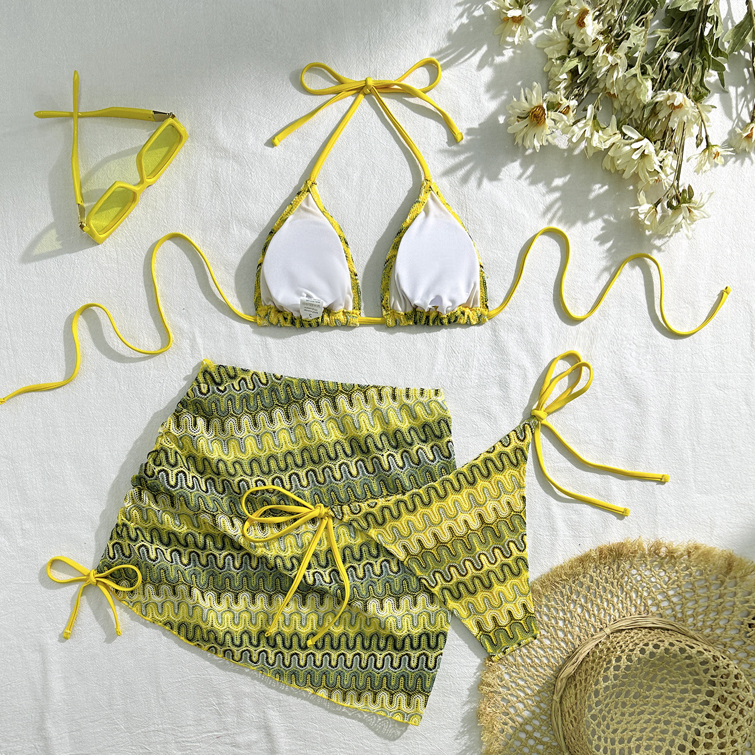 Enhance your swimwear collection with this stylish three-piece set, featuring a gradient-embroidered bikini top, matching bottoms, and a coordinating cover-up. The ruched and tie elements add a touch of elegance, making it perfect for beach outings or poolside relaxation. Crafted from high-quality polyester, this swimsuit ensures comfort and durability for all-day wear.