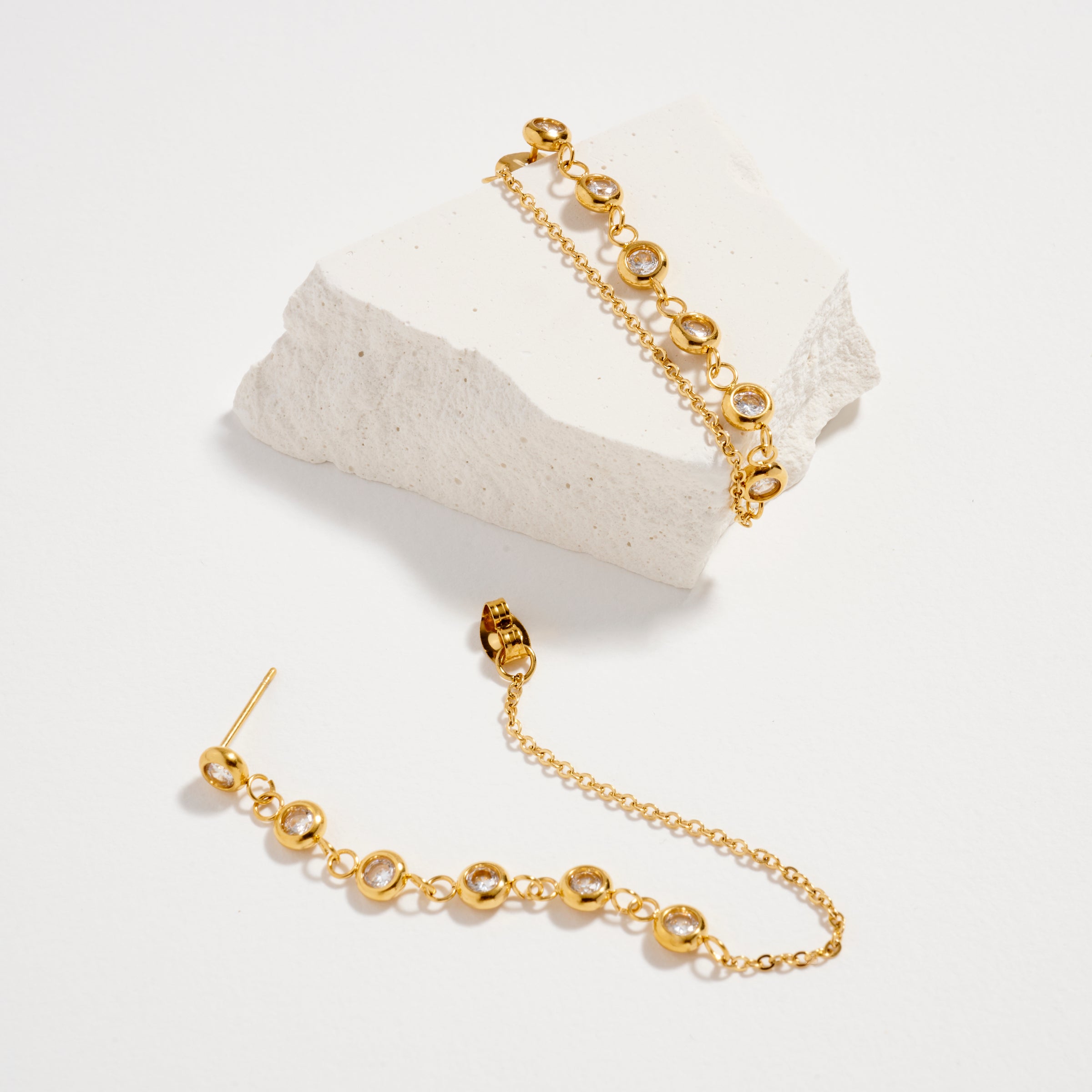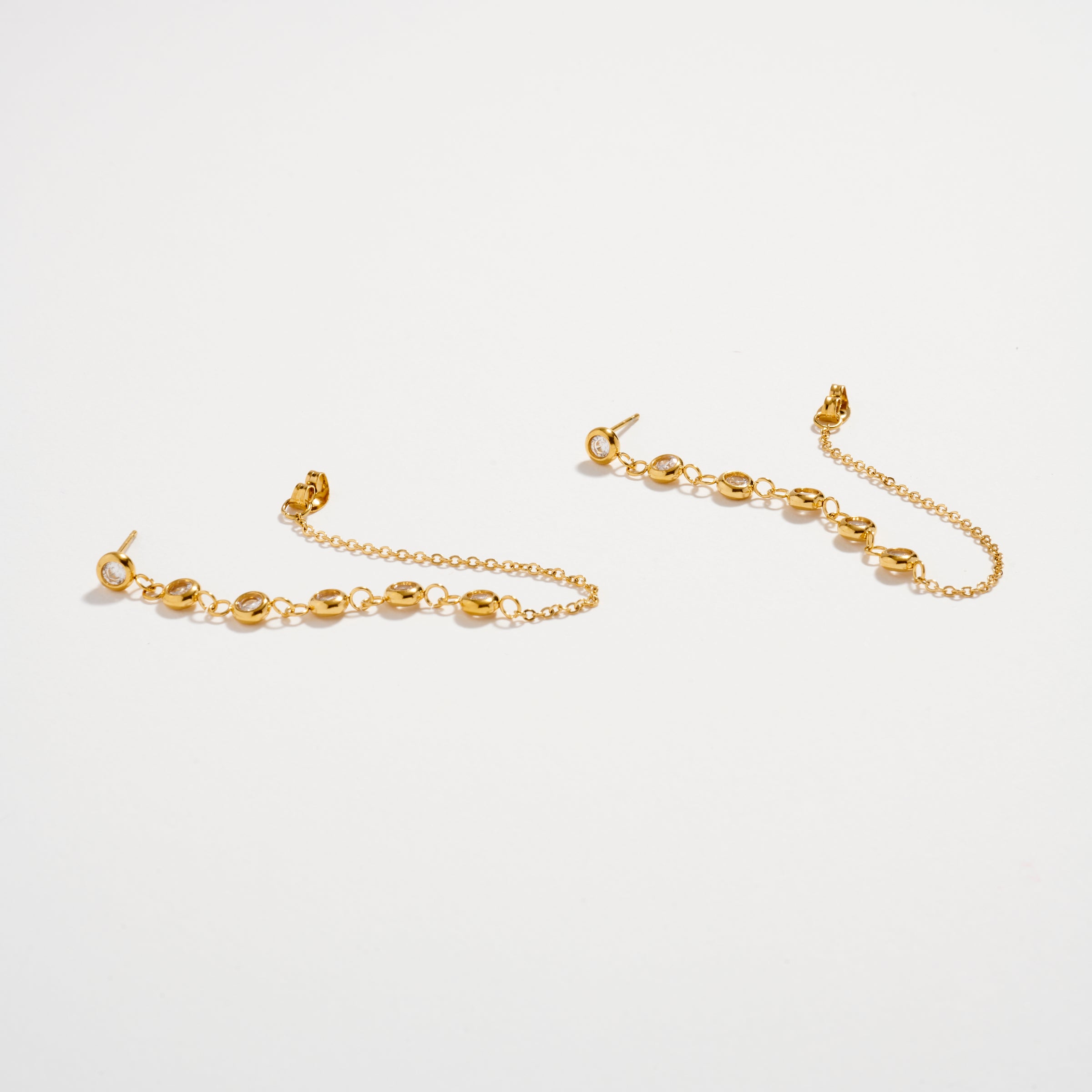 Elegant and refined, these Stainless Steel CZ Chain Drop Earrings feature bezel-set cubic zirconia stones connected in a delicate chain, creating graceful movement with every turn. A fine gold-tone chain attaches behind the ear for a modern layered effect, blending classic sparkle with contemporary design. Crafted from hypoallergenic stainless steel, they are tarnish-free, water-resistant, and designed for lasting shine.