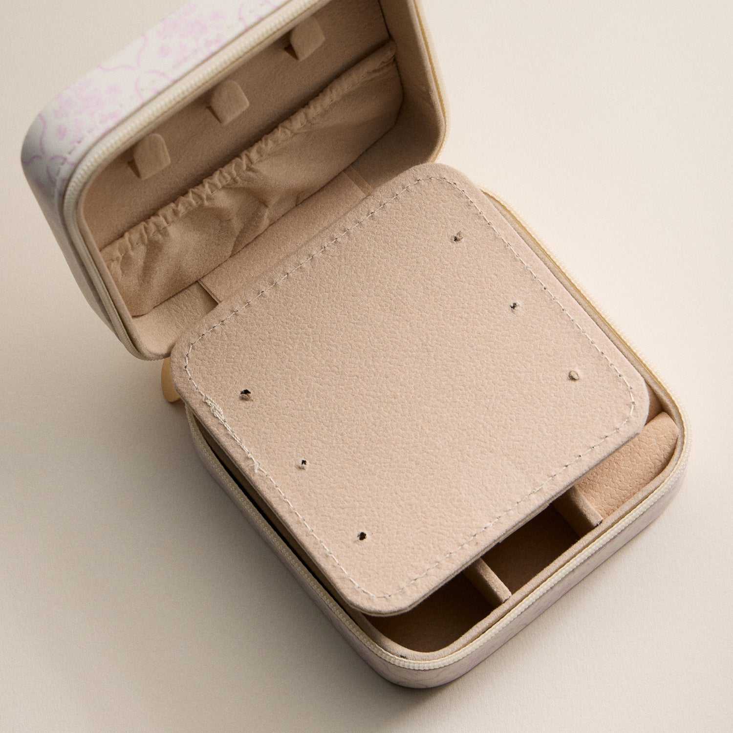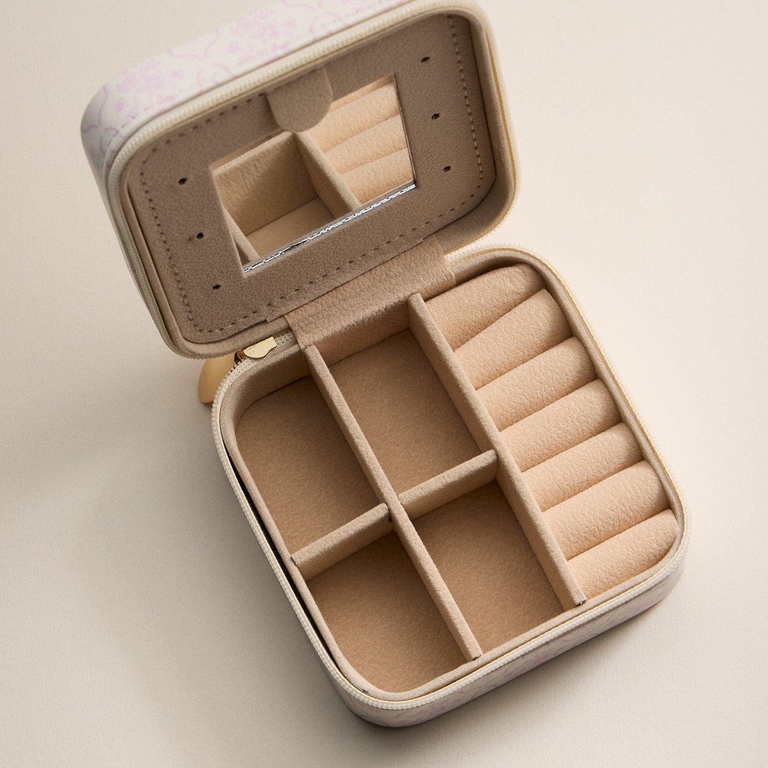 Keep your favorite pieces organized and protected with this elegant Pink Floral Travel Jewelry Case. Designed in a soft blush and ivory floral print, it features a structured zip-around closure with a gold-tone pull for a polished finish. Inside, a velvety beige interior includes divided compartments, ring rolls, earring holes, and a built-in mirror for easy accessorizing on the go. Compact, lightweight, and perfect for travel, gifting, and everyday storage.