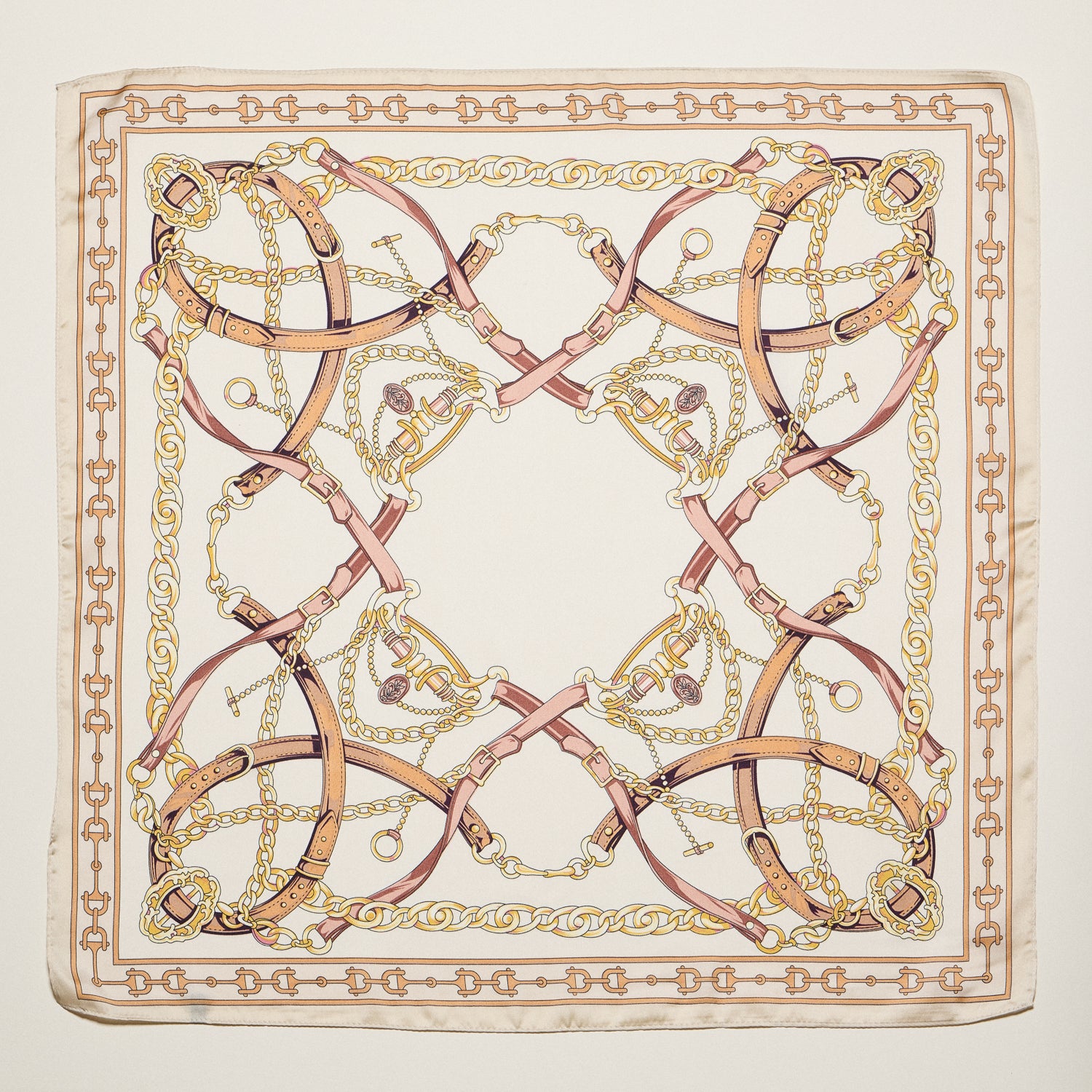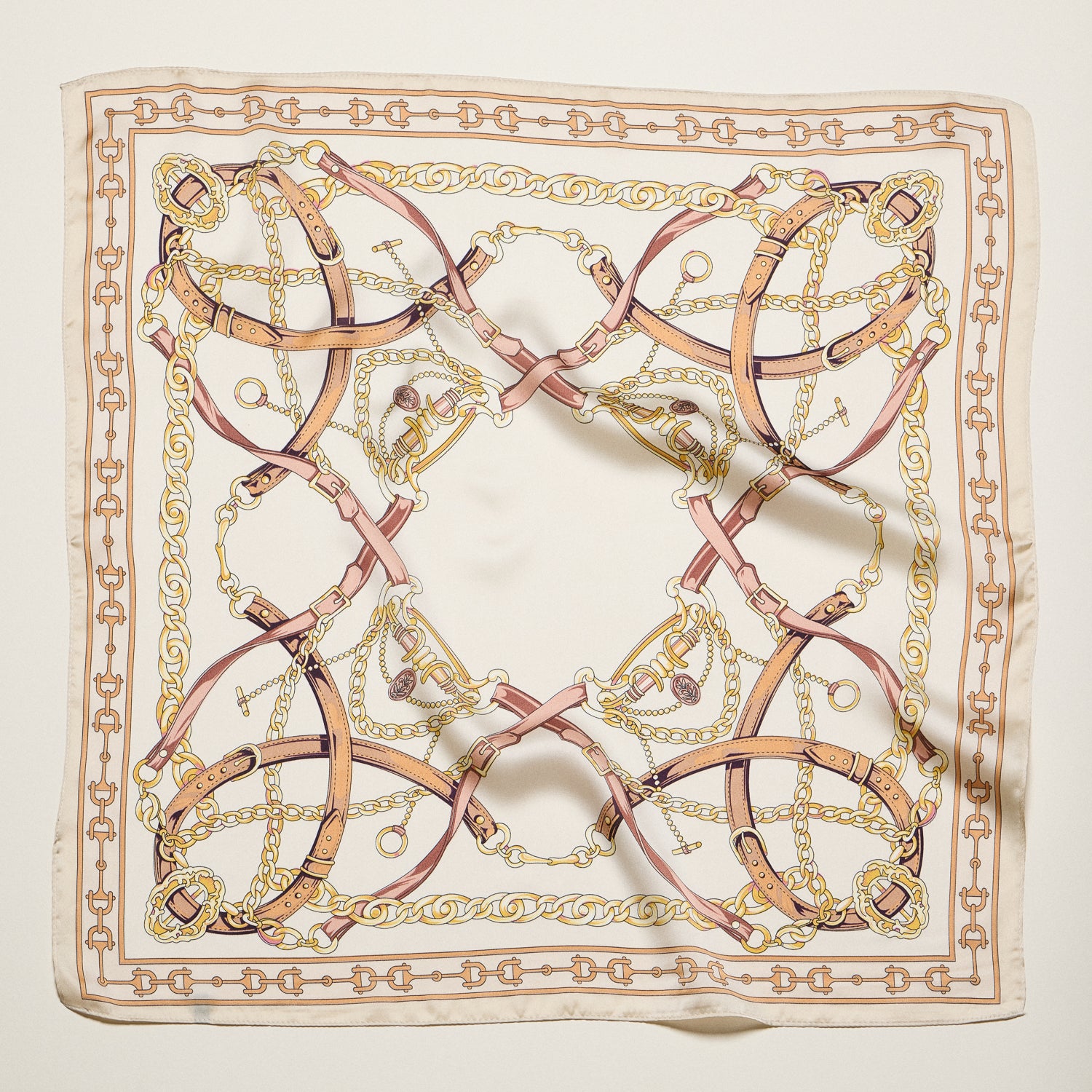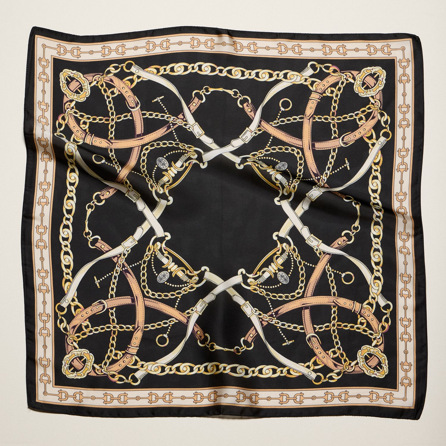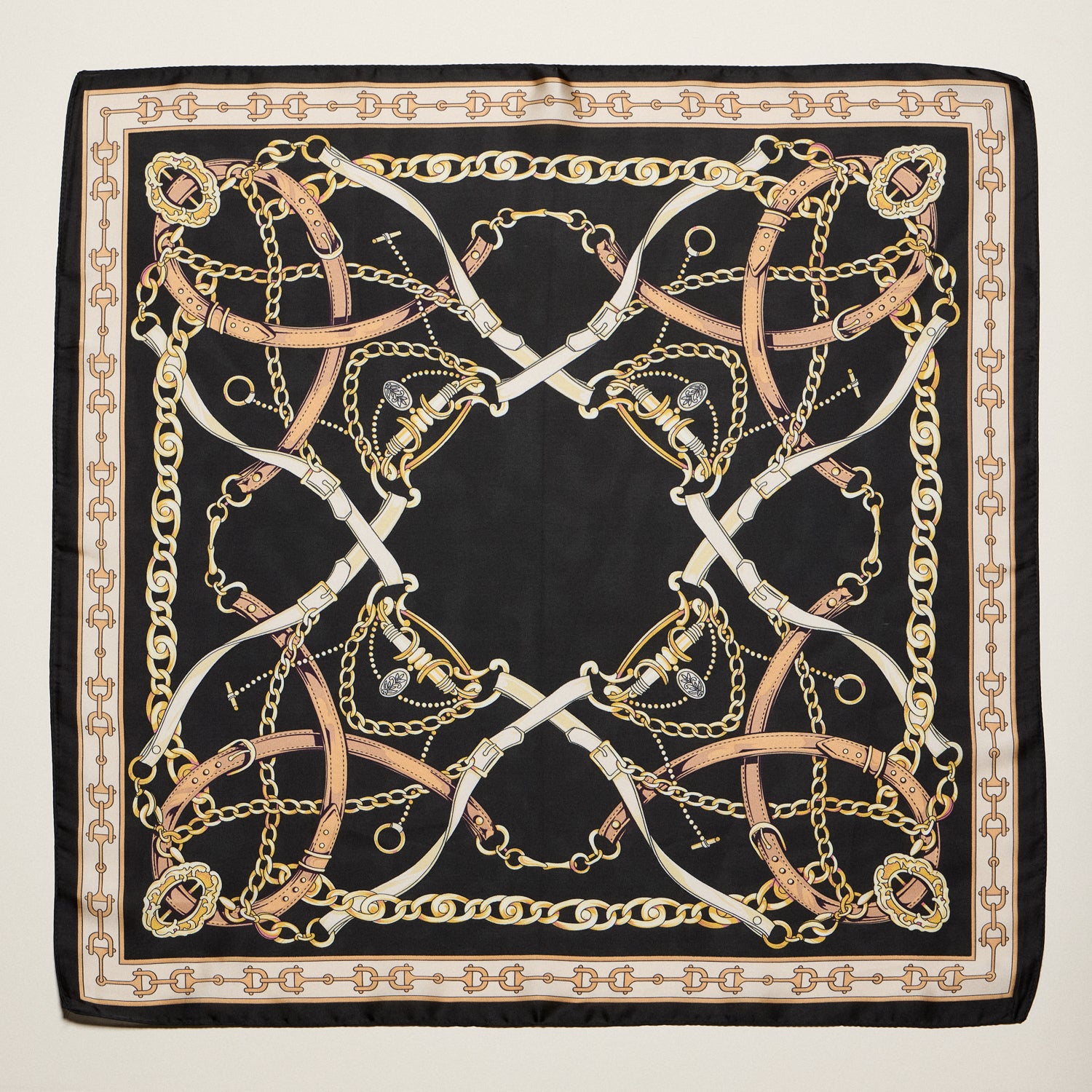 Classic Equestrian Chain Square Scarf – Vintage Belt & Gold Chain Print Silk-Feel Scarf