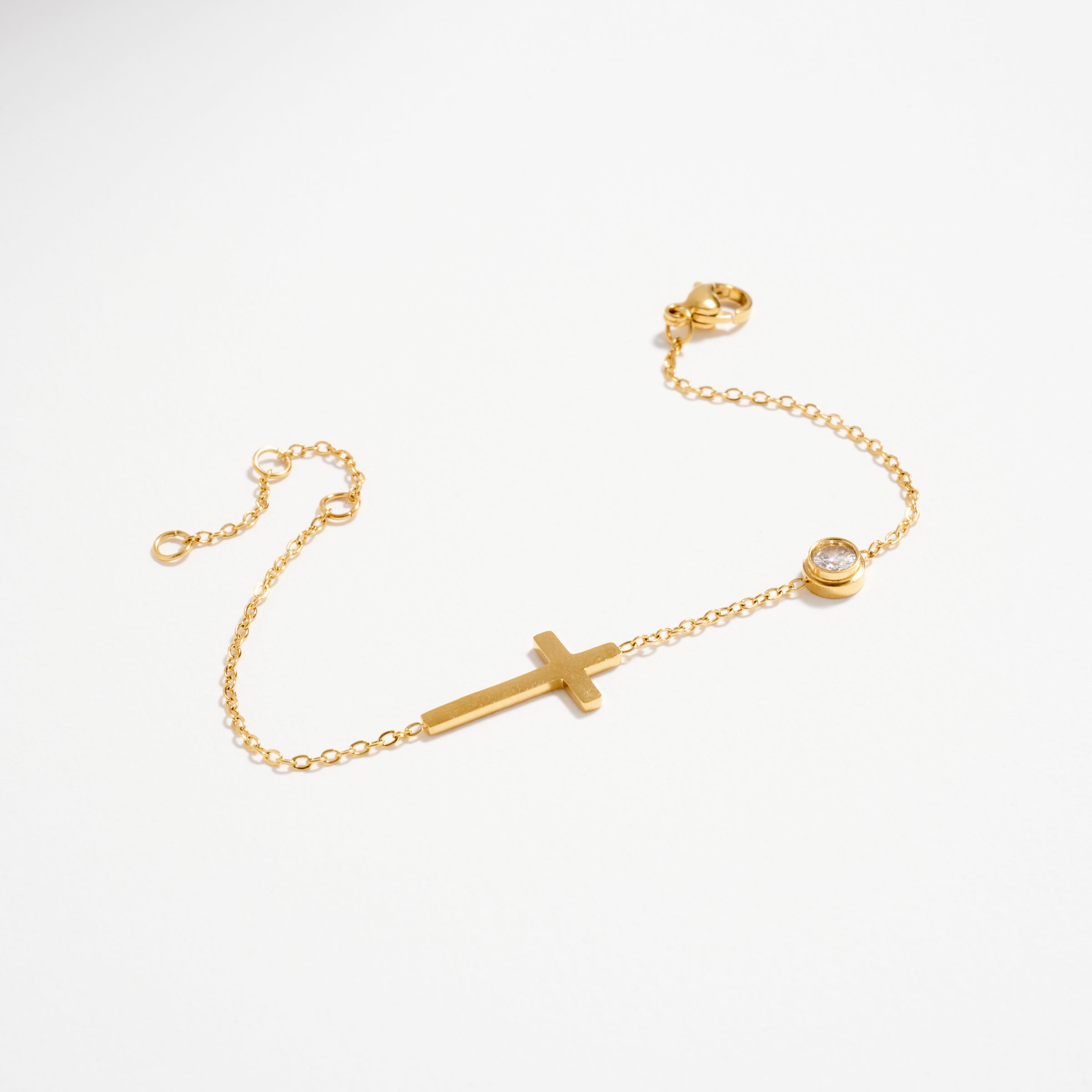 A timeless symbol of faith and style, this gold-tone cross bracelet features a sleek horizontal cross paired with a sparkling CZ accent on a delicate adjustable chain. Lightweight and elegant, it’s perfect for layering or wearing on its own as an everyday statement of grace.