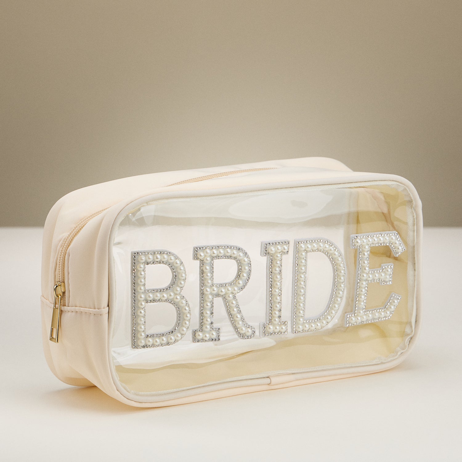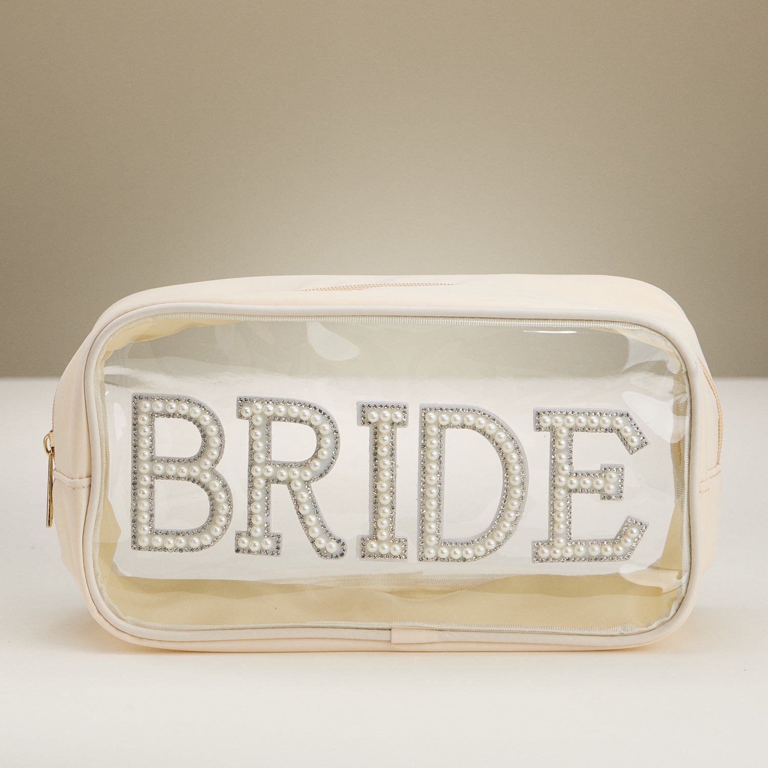 Make a statement with these clear PVC travel pouches, perfect for beach days, bachelorette weekends, or getaway glam. Each bag is trimmed in nylon and features bold raised lettering—choose from a colorful terry “SALTY” design or a pearl-embellished “BRIDE” for the ultimate bridal moment. Durable, easy to clean, and full of personality.