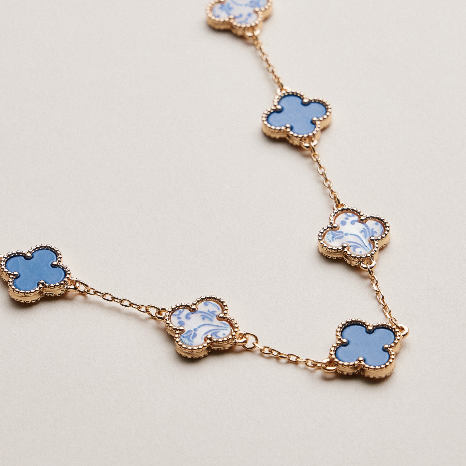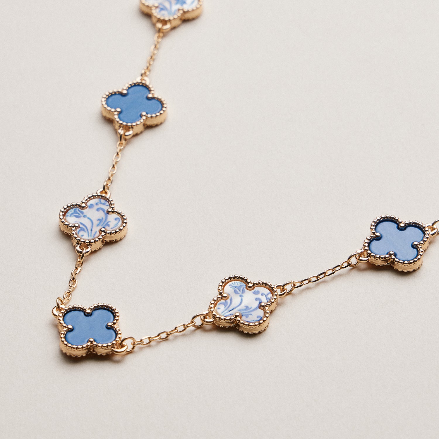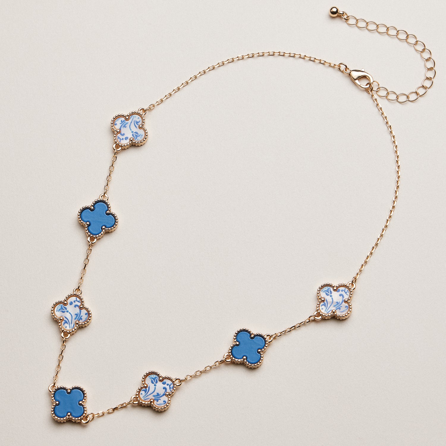 Delicate and eye-catching, this Blue Porcelain Clover Station Necklace blends timeless elegance with a modern, playful touch. Featuring alternating clover-shaped charms in soft sky blue and intricate porcelain-inspired floral patterns, each station is framed in a warm gold-tone setting for a refined finish.
