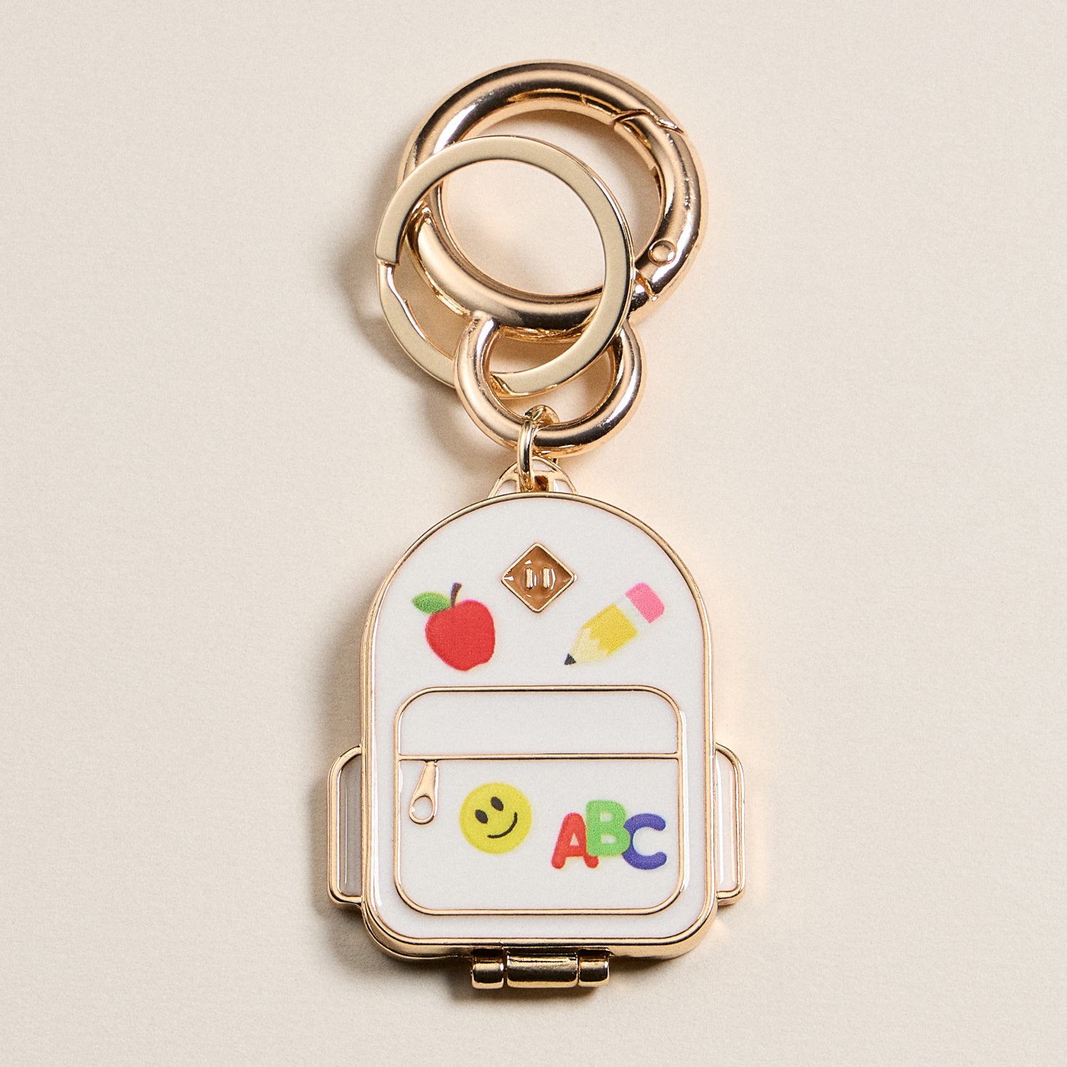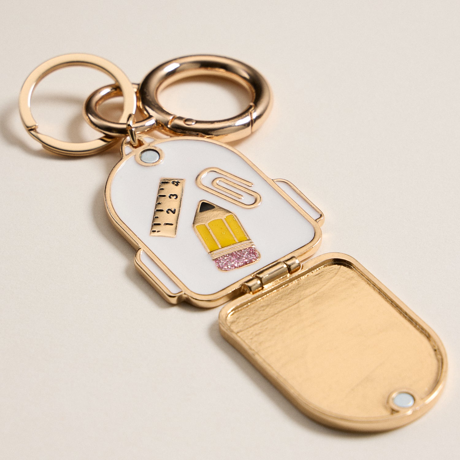 Celebrate school spirit with this playful backpack-shaped keychain locket, finished in shiny gold with colorful enamel details. Featuring charming school supply icons like a pencil, ruler, and smiley face, this hinged locket opens to reveal extra design accents inside. A perfect accessory for teachers, students, or anyone who loves back-to-school vibes.