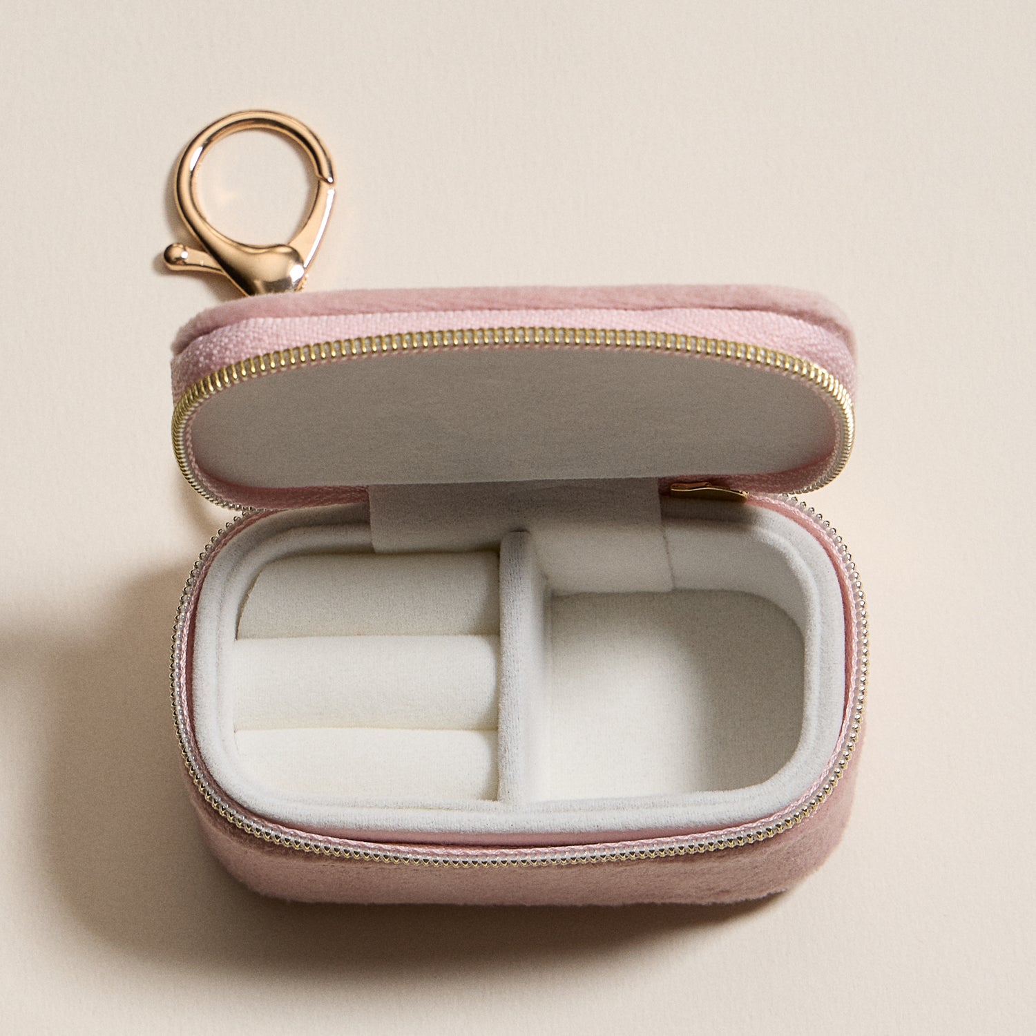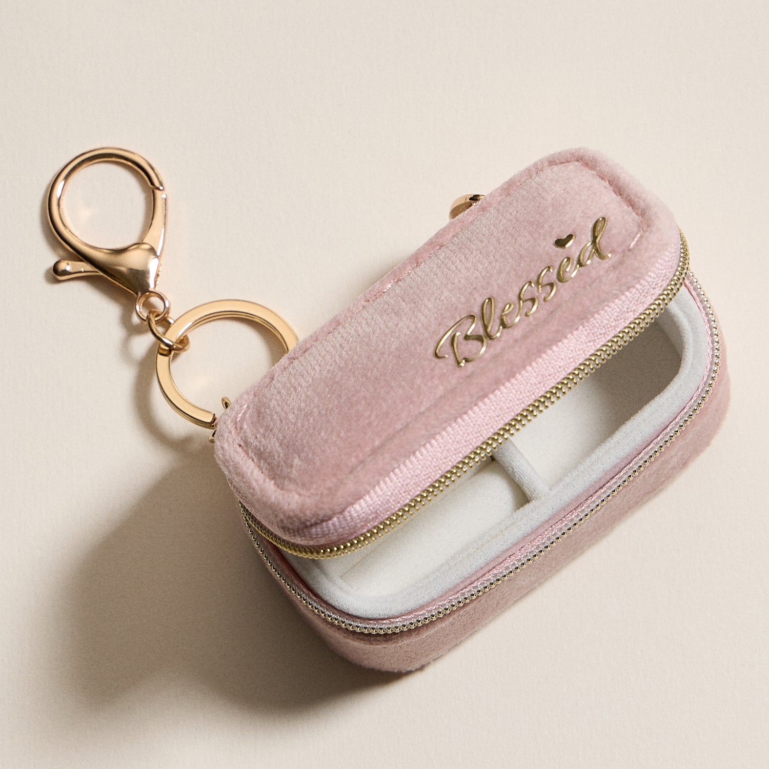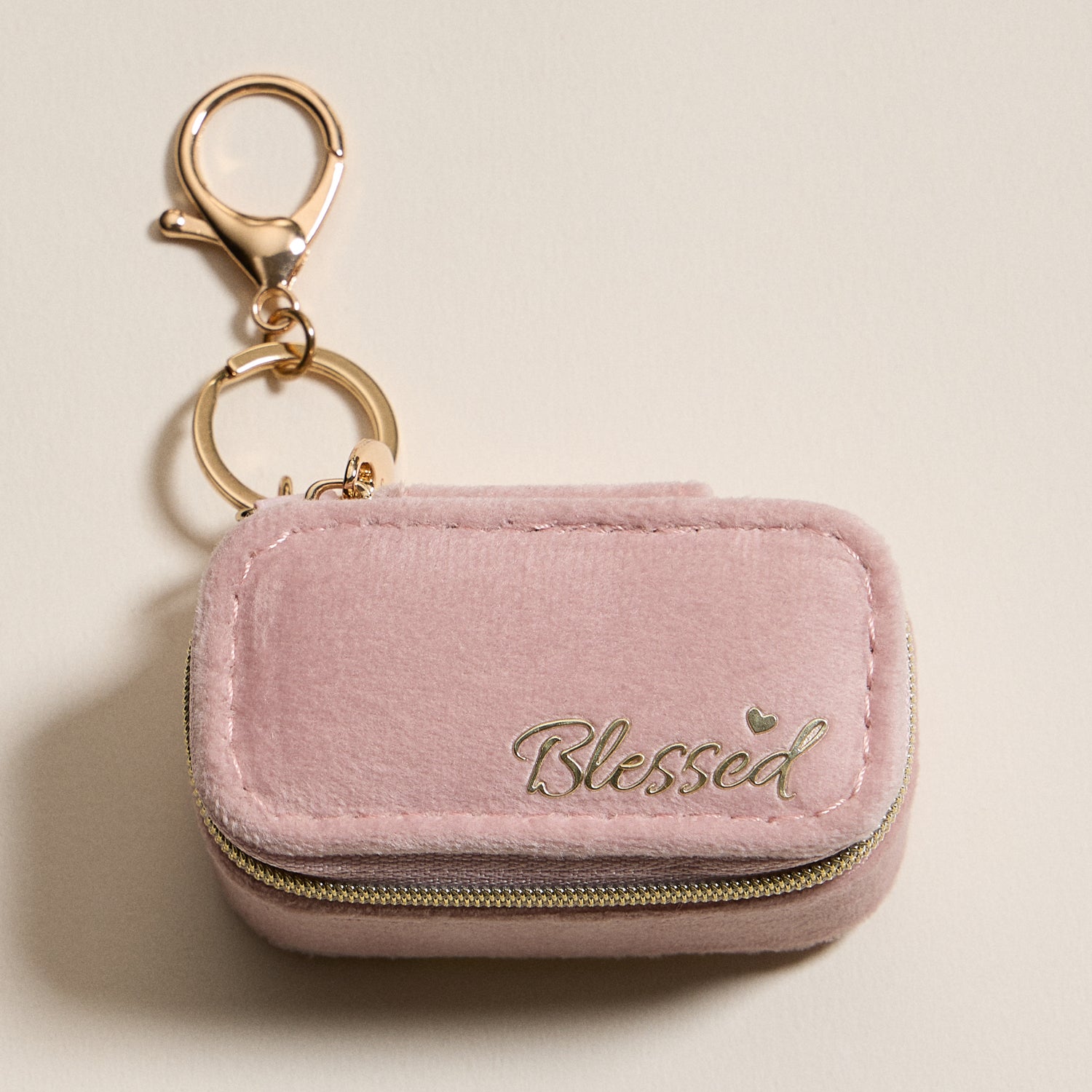 Carry your jewelry with elegance and meaning using our Pink Velvet Mini Jewelry Travel Case. Embroidered with the word “Blessed” in metallic lettering, this compact case features soft velvet fabric, ring slots, and compartments for earrings, necklaces, or keepsakes. Its secure zipper closure and gold keychain clip make it easy to attach to your bag or keys. A thoughtful and stylish gift for travel or everyday use.