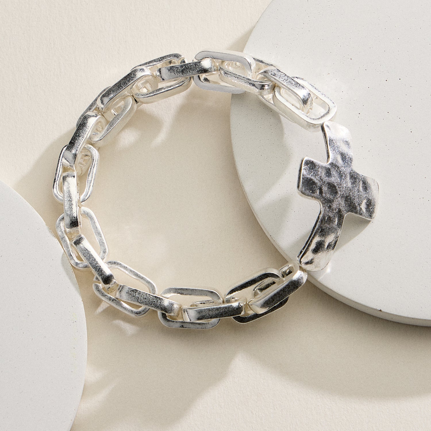 Bold and refined, this hammered cross charm chain bracelet blends modern edge with timeless faith symbolism. Featuring a substantial link chain and a textured cross centerpiece, this statement bracelet is available in gold, silver, and two-tone finishes for versatile, elevated styling.