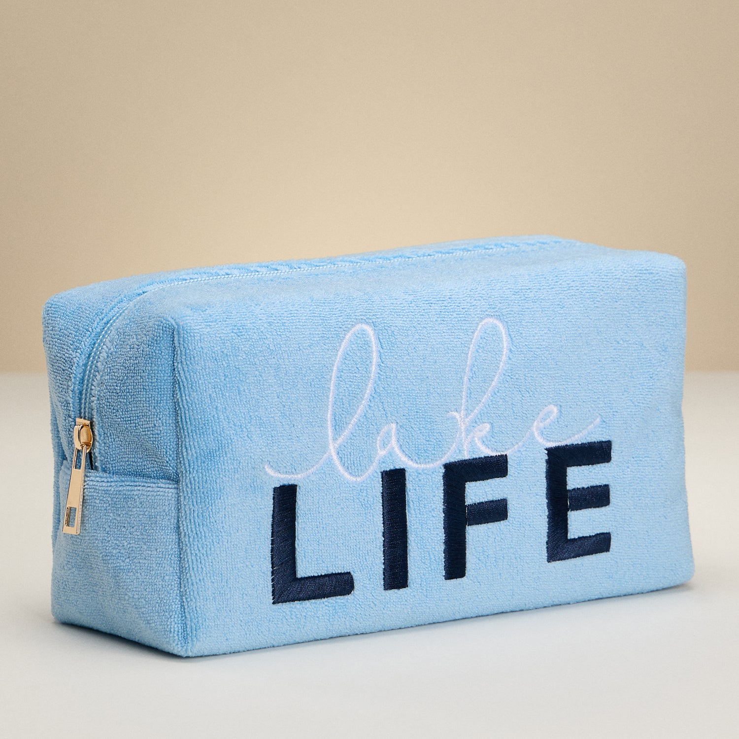 Keep your lakeside essentials stylishly stashed with the Lake Life Terry Cloth Pouch. Featuring bold navy embroidery on sky blue terry polyester, this pouch is perfect for sunny getaways, boat days, or weekend trips. Soft, absorbent, and easy to pack, it keeps everything from makeup to mini accessories safe in one chic spot.