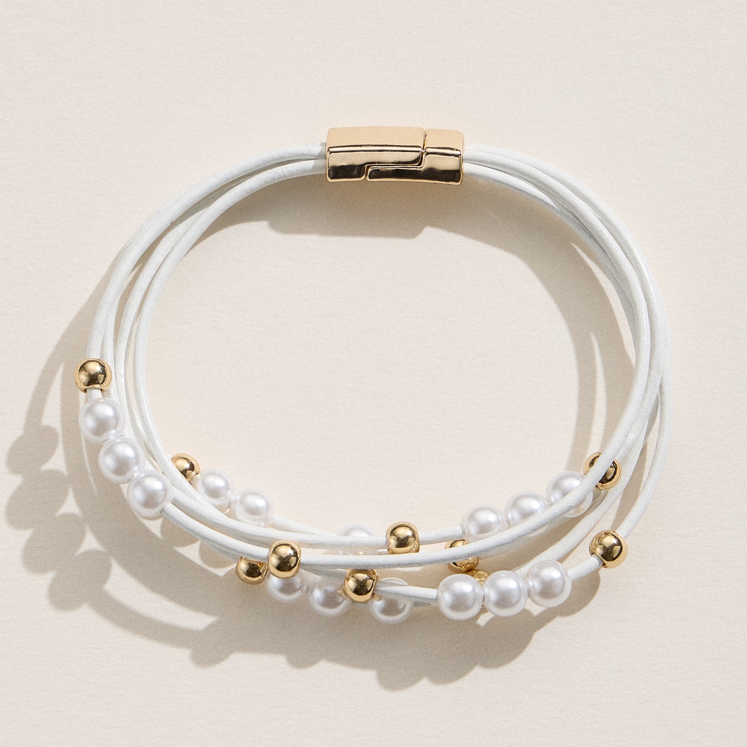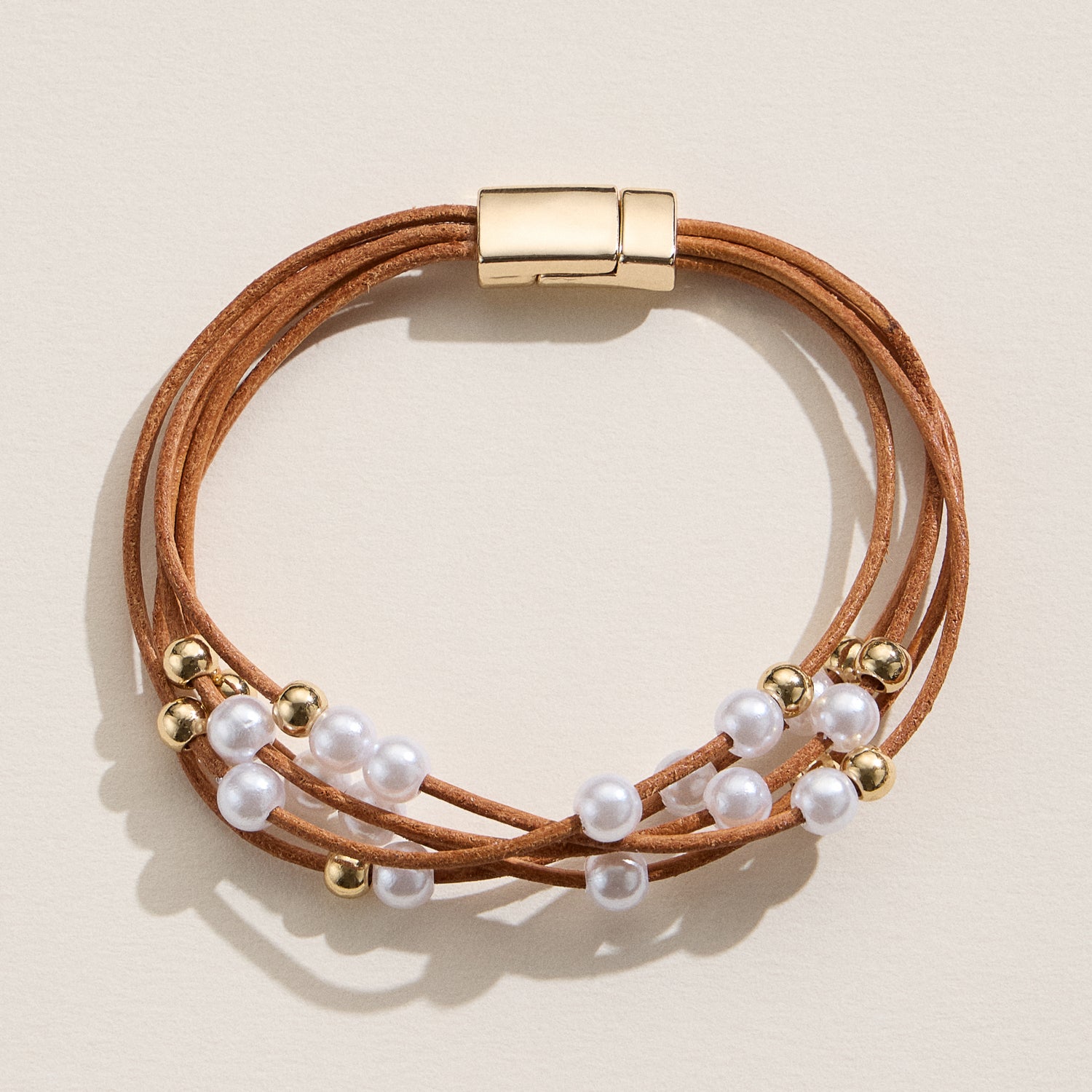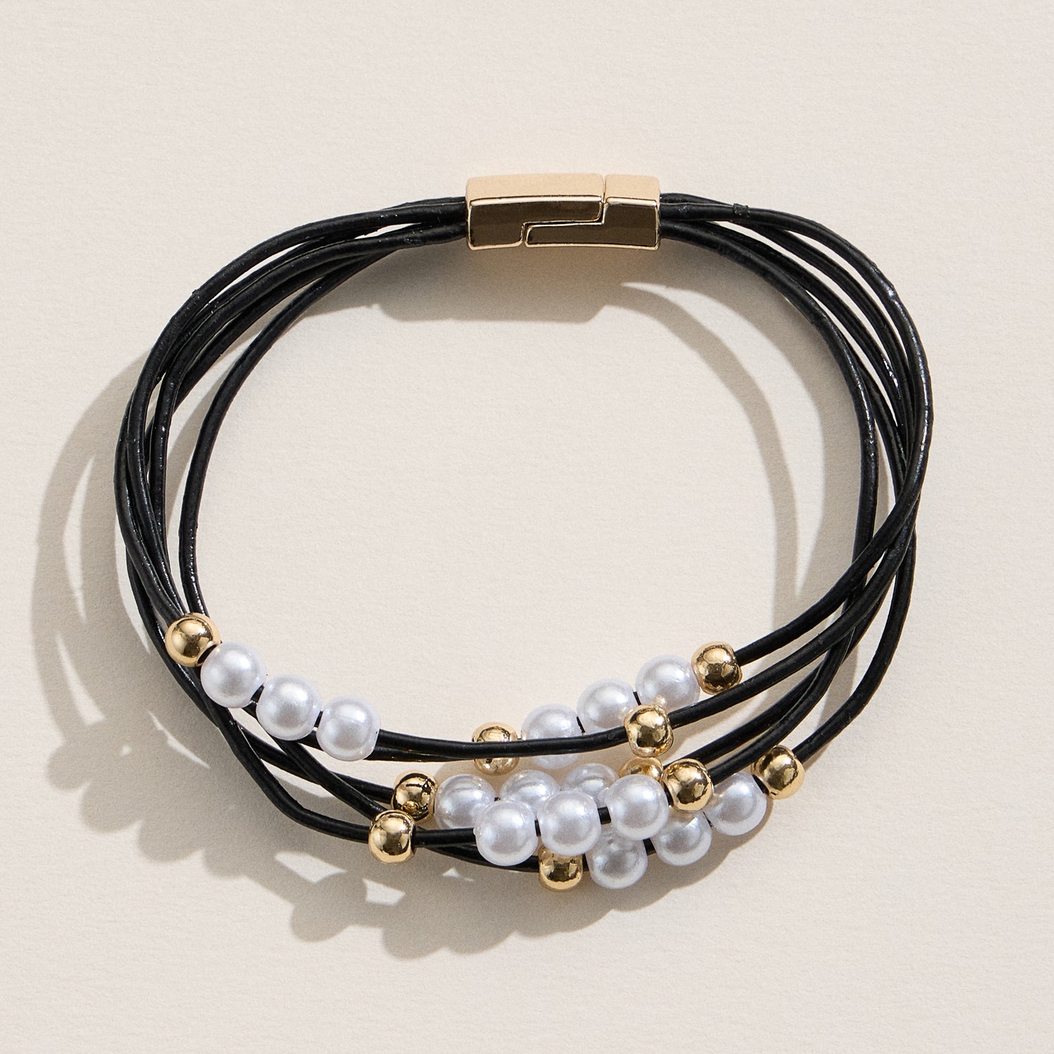 Chic and effortlessly stylish, this multi-strand bracelet features faux freshwater pearls accented with polished gold-tone beads on soft, layered cords. The combination of textures and elements creates a modern boho look that transitions seamlessly from casual to elevated outfits.