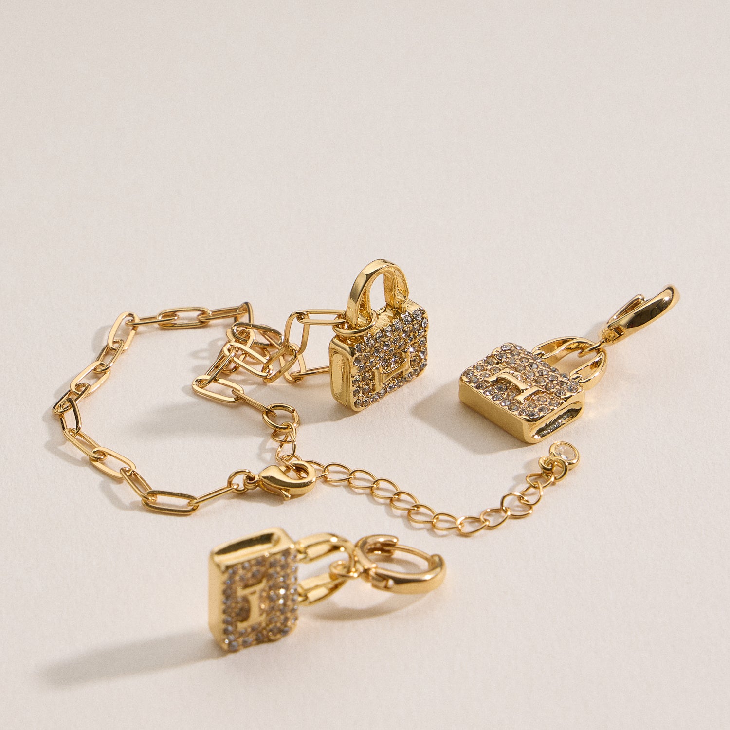 This gold chain bracelet features a sparkling crystal lock charm, blending edgy style with luxe elegance. Perfect for layering or making a solo statement, it's a standout addition to any jewelry collection.