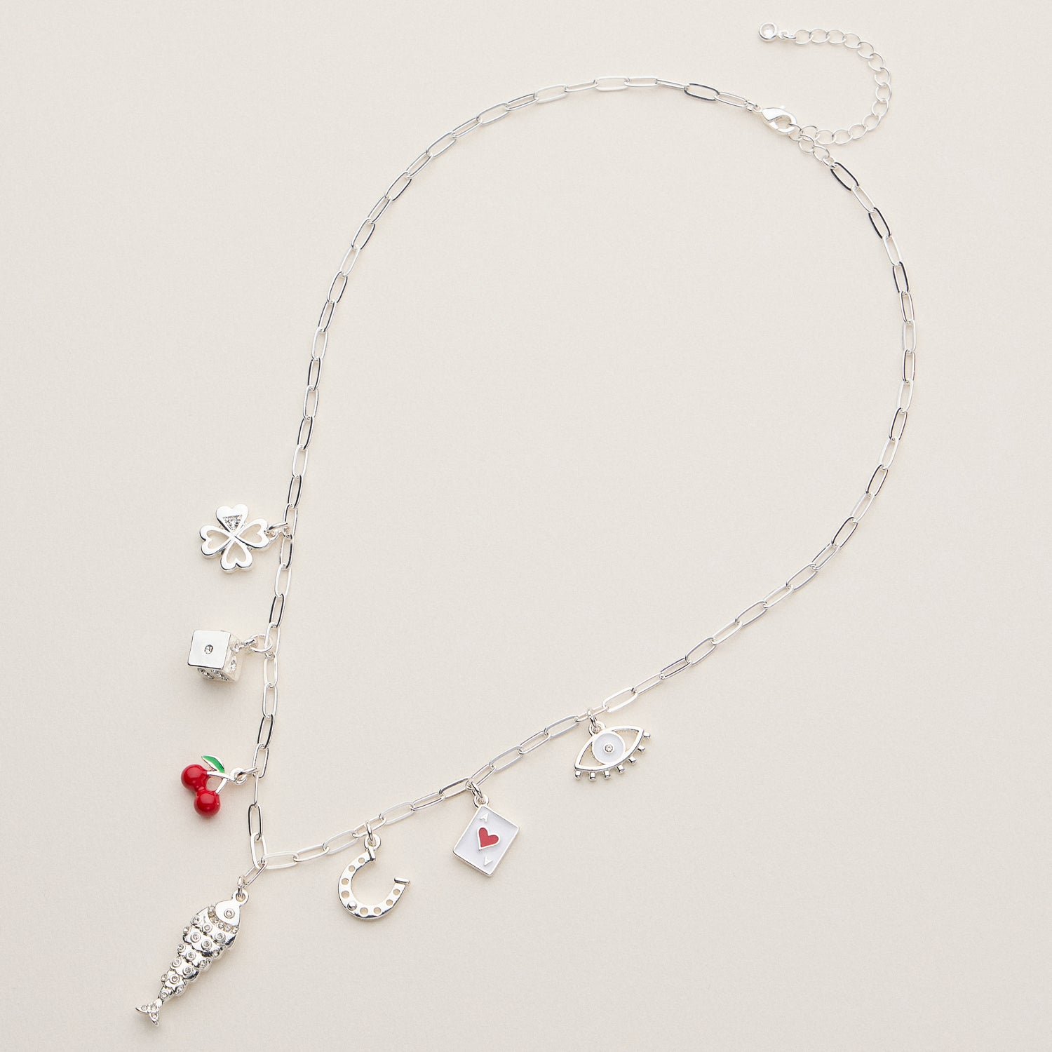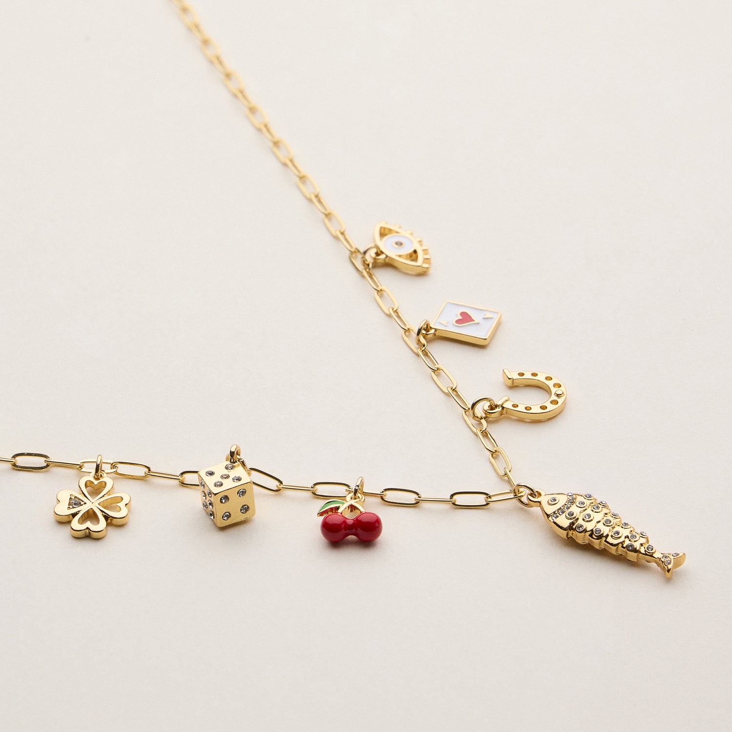 Channel all the good fortune with this 18K gold dipped lucky icons necklace. Featuring playful charms like a clover, dice, cherries, horseshoe, fish, playing card, and evil eye—this whimsical piece blends charm and meaning in one standout accessory. Also available in silver, with an adjustable chain for a perfect fit.