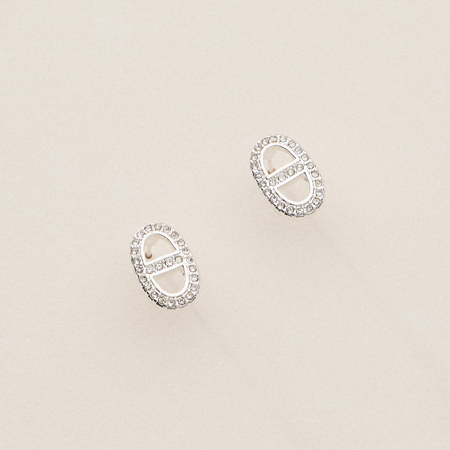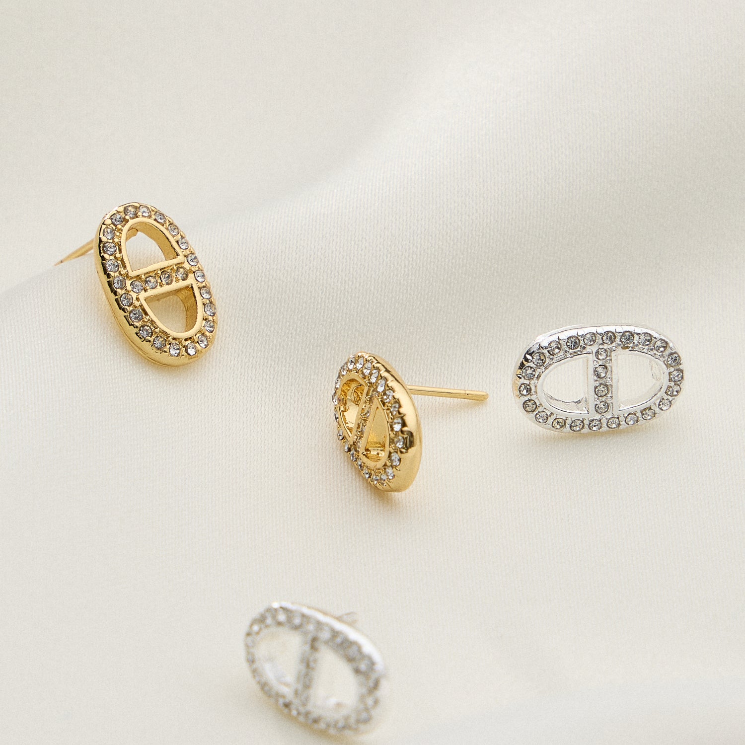 Elevate your everyday sparkle with these 18K gold dipped pave oval link studs. Featuring a cutout design framed with shimmering pave crystals, these studs combine structure and shine in a refined silhouette. Available in gold and silver finishes, they’re the perfect balance of modern glam and timeless style.