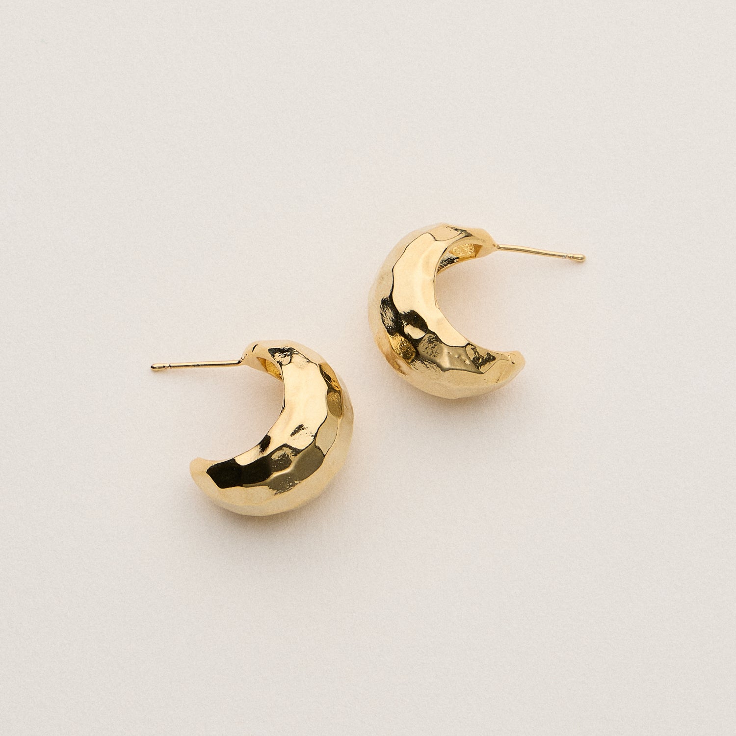 Bold meets sculptural in these 18K gold dipped chunky hammered hoop earrings. With their wide crescent shape and textured finish, they offer a modern twist on the classic hoop. Lightweight and statement-worthy, these hoops bring shine and style whether you're dressing up or down. Also available in a high-polish silver tone, they’re the perfect pair for anyone who loves chunky earrings with an artful edge.