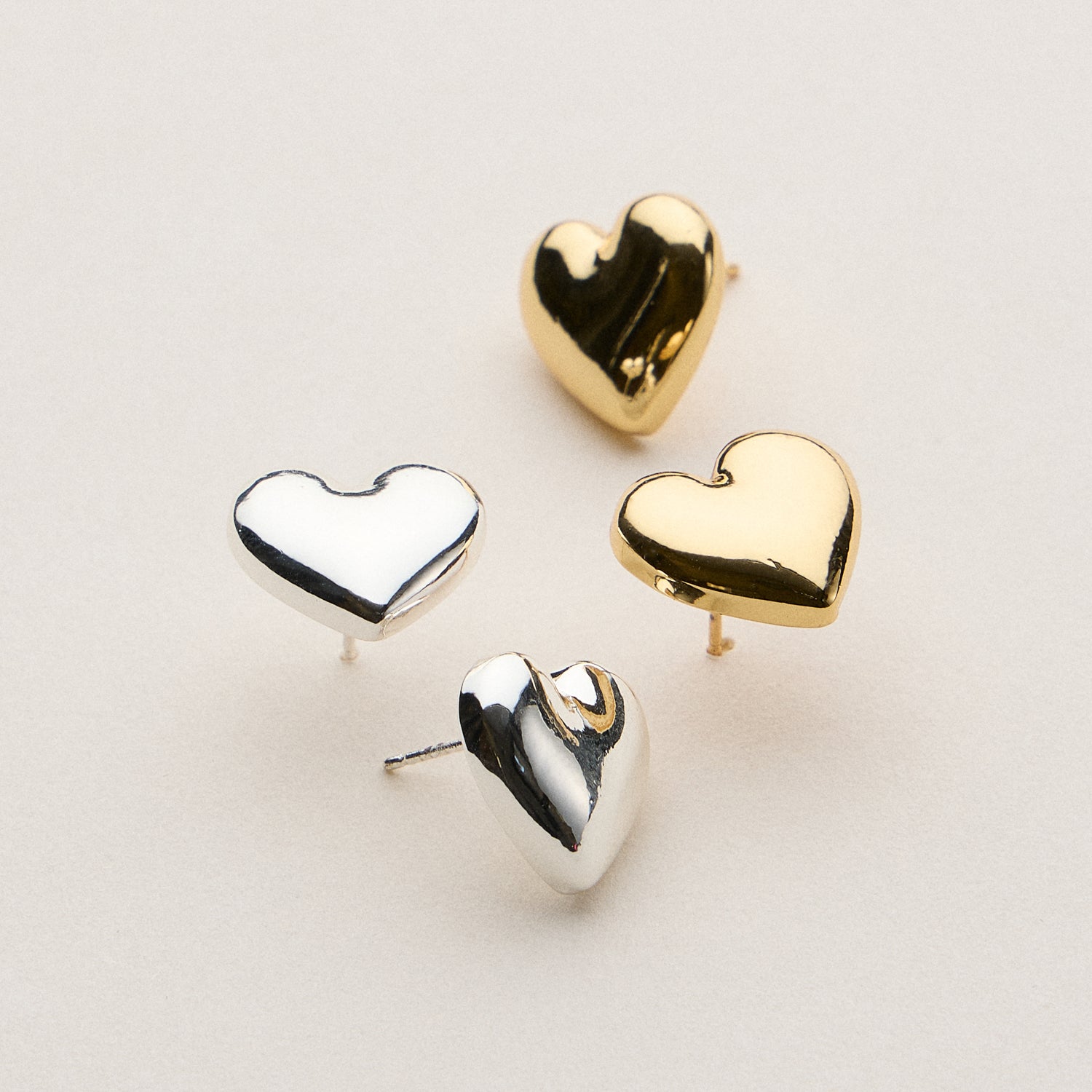 Timeless and charming, these 18K gold dipped puffy heart stud earrings feature a perfectly rounded silhouette with a high-polish finish. Whether worn as an everyday staple or a romantic gift, they offer just the right amount of shine and sweetness. Lightweight and versatile, these heart earrings pair effortlessly with casual outfits or elegant looks. Also available in a sleek silver tone, they’re a must-have addition to any earring collection.
