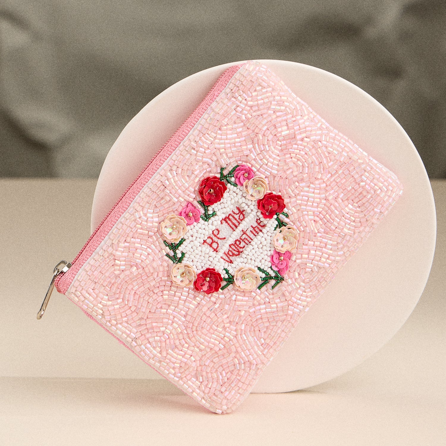 Beaded "Be My Valentine" Zip Pouch – Romantic Pink Floral Clutch