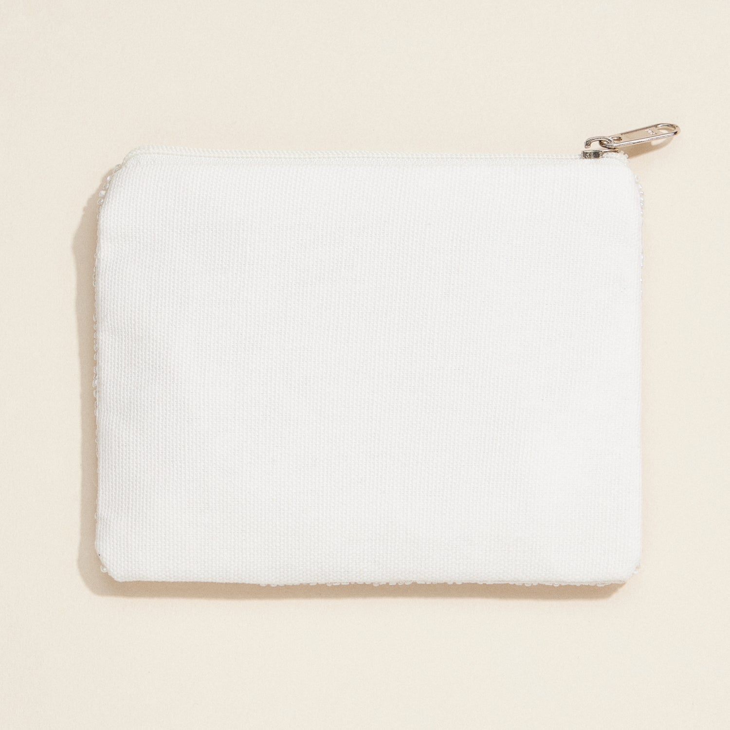 Show your support with this stunning beaded breast cancer awareness zip pouch. Featuring the powerful message "Her Fight Is Our Fight" with a bold pink ribbon and heart accents, this white sequin clutch is both stylish and meaningful. Perfect for carrying essentials, this zippered pouch makes a great gift for survivors, warriors, and supporters alike. Whether for Breast Cancer Awareness Month, fundraising events, or daily inspiration, this pouch is a beautiful way to spread awareness and strength.