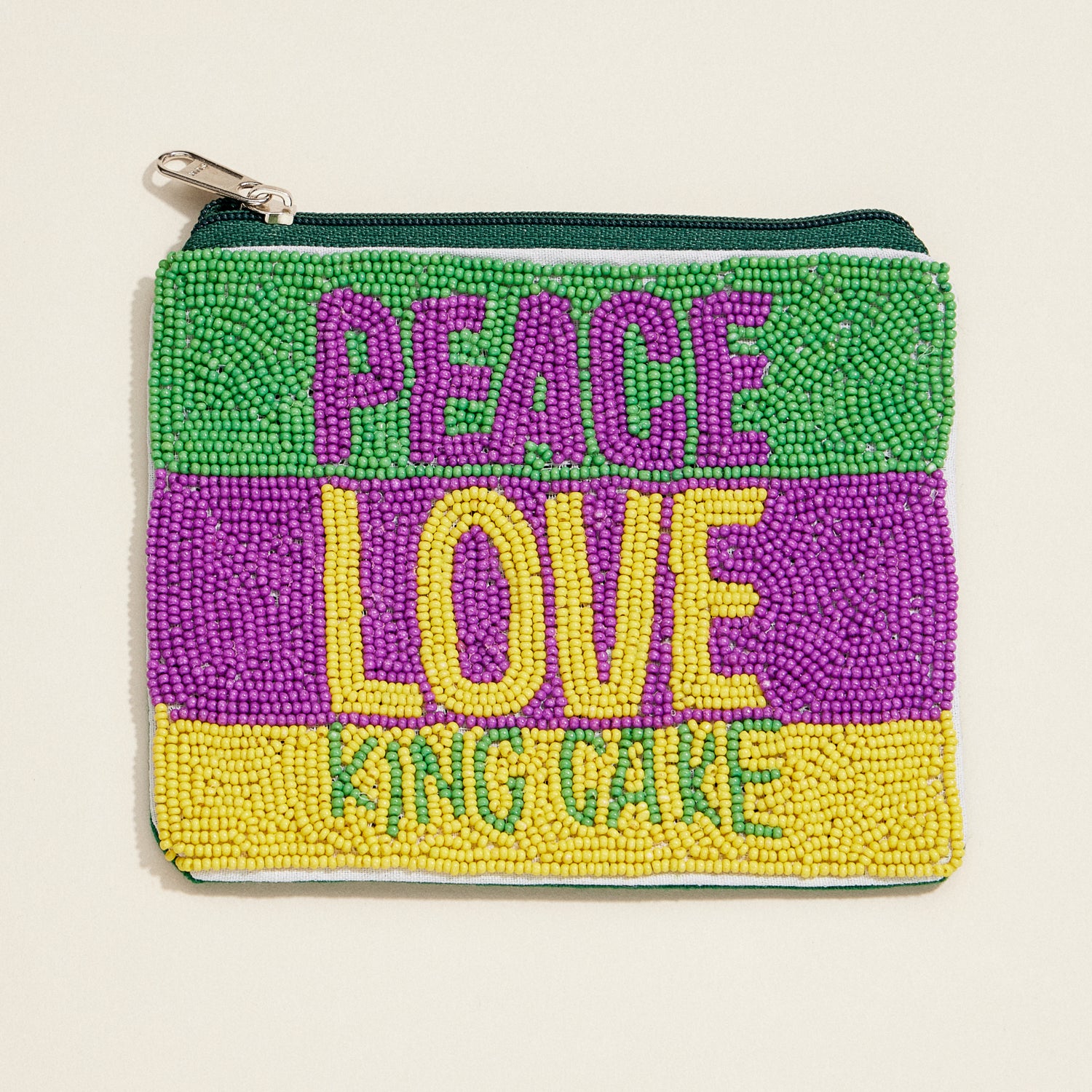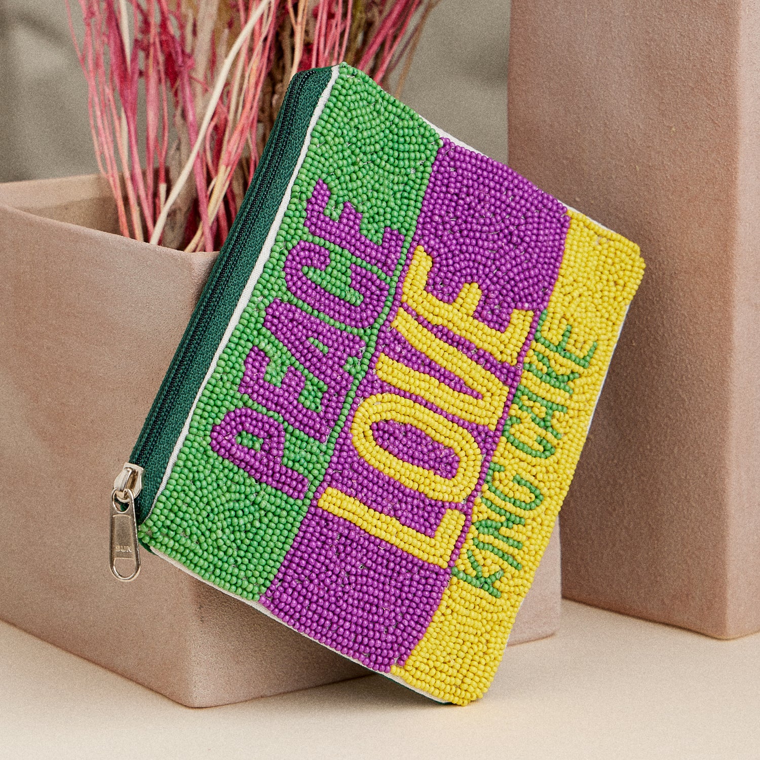 Beaded "Peace, Love, King Cake" Zip Pouch – Festive Mardi Gras Clutch