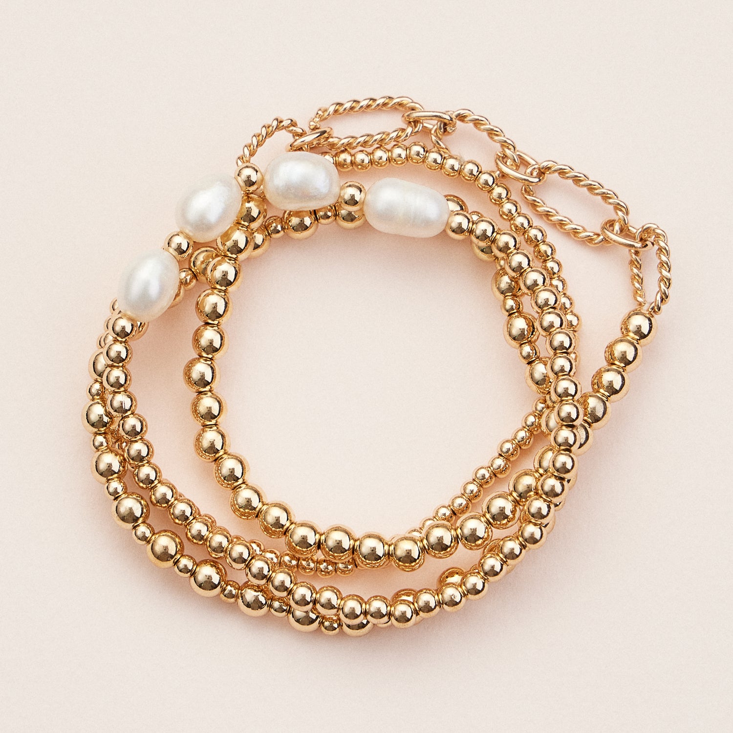 Gold Beaded Stretch Bracelet Set – Dainty Layered Bracelets with Freshwater Pearls & Chain Accent