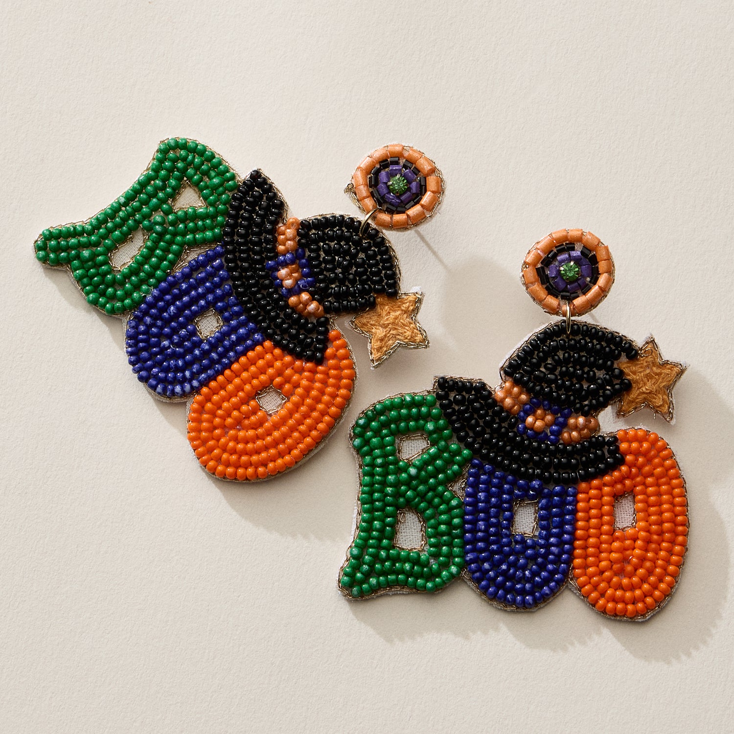 Add a pop of Halloween fun to your outfit with these vibrant beaded “BOO” earrings featuring a playful witch hat and star detail. Crafted with bright green, purple, orange, and black seed beads, these statement earrings are a festive must-have for spooky season. Lightweight and full of charm, they’re perfect for Halloween parties, costumes, or showing off your spooky spirit all October long. The detailed design brings color, character, and handcrafted charm to any look.