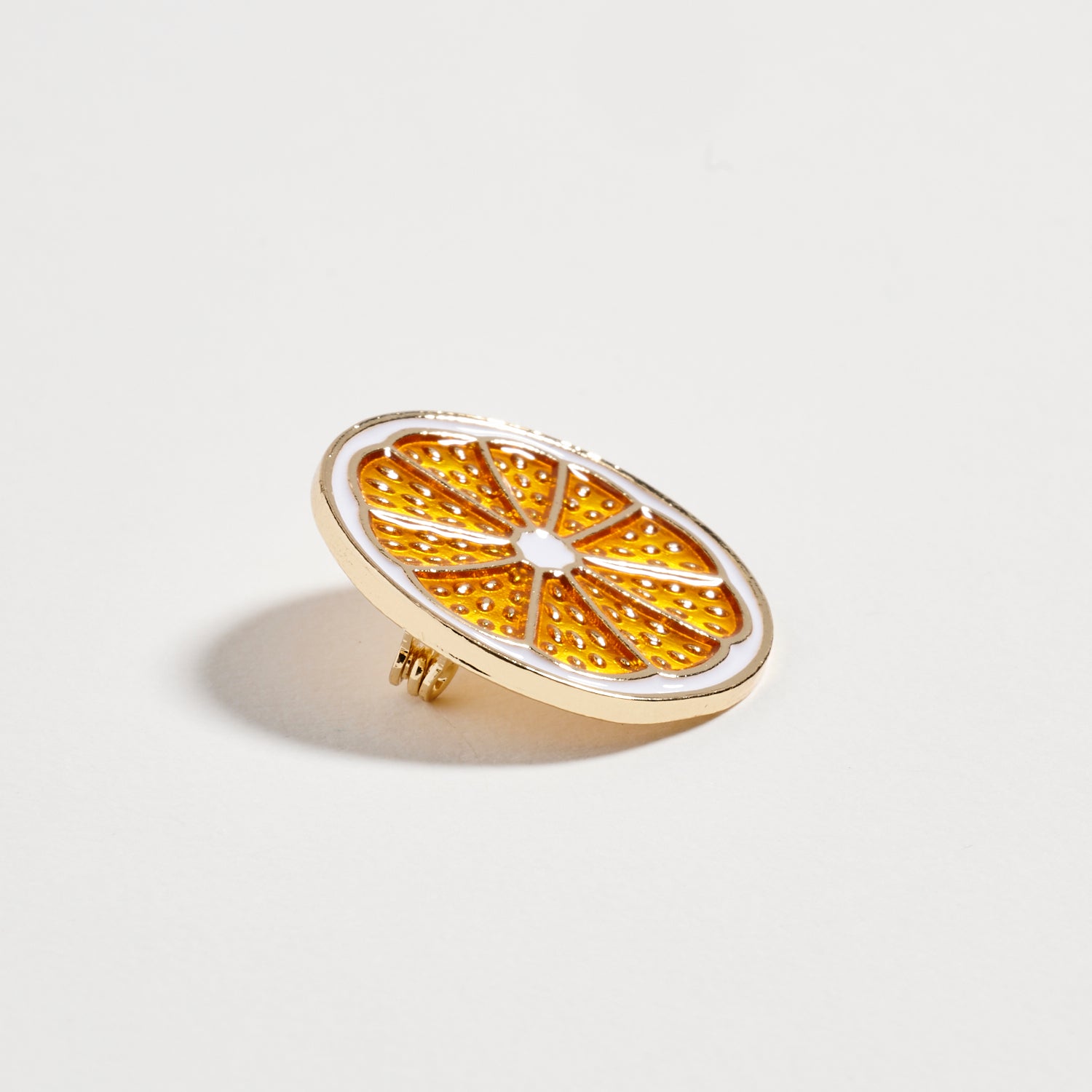 Fresh and vibrant, this gold tone orange slice brooch features glossy orange enamel segments framed by crisp white enamel and a polished gold border. Designed to resemble a realistic citrus cross-section, this playful yet refined accessory adds a bright pop of color to blazers, denim jackets, dresses, and tote bags.