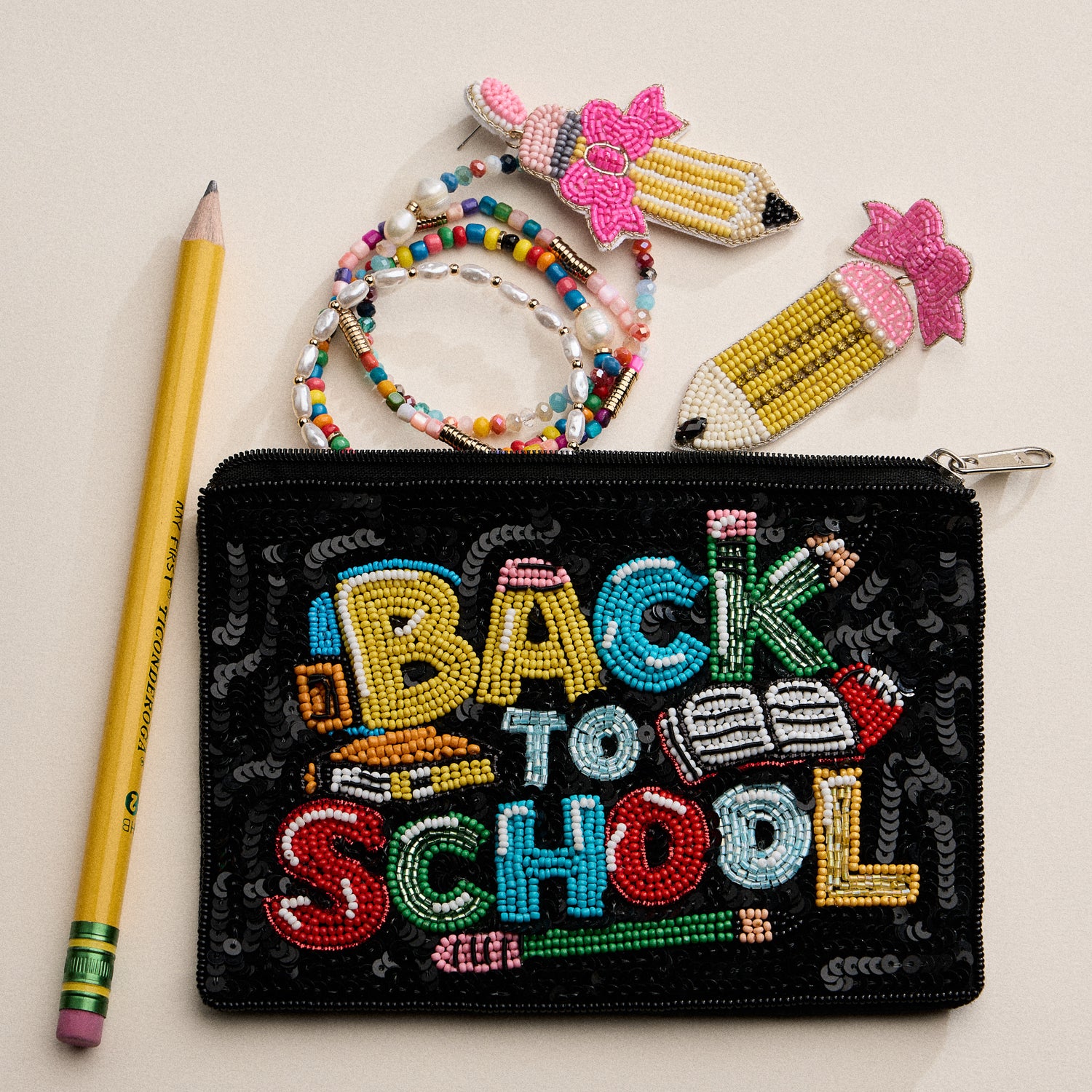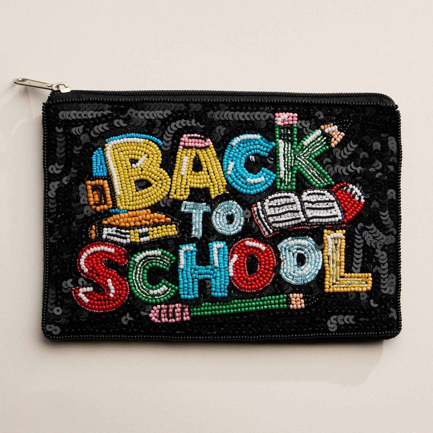 Start the school year in style with this fun beaded Back to School pouch. Featuring vibrant hand-beaded designs with books, pencils, and colorful text on a black sequin background, it’s perfect for holding pencils, pens, or small essentials. A must-have for students, teachers, or anyone who loves school vibes.