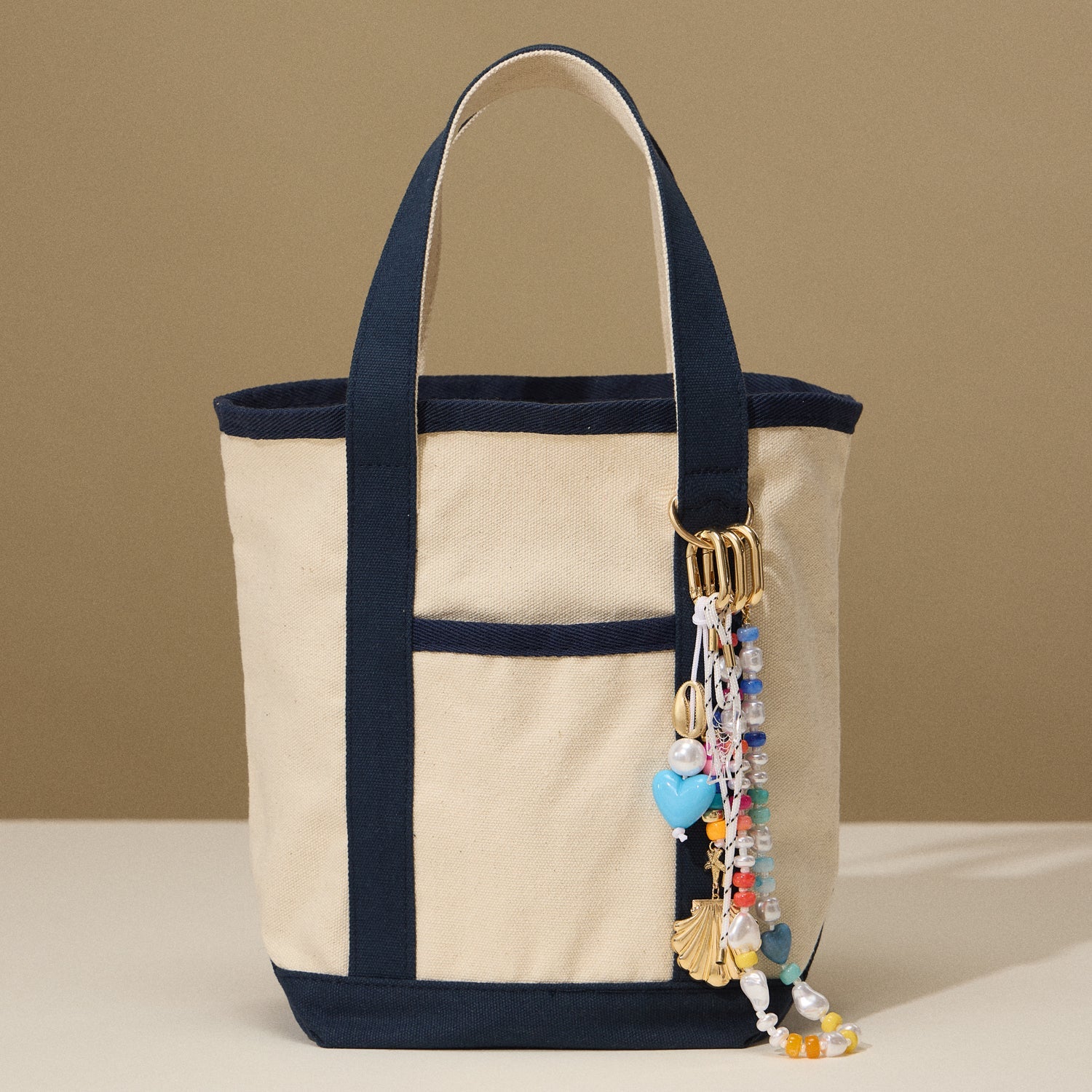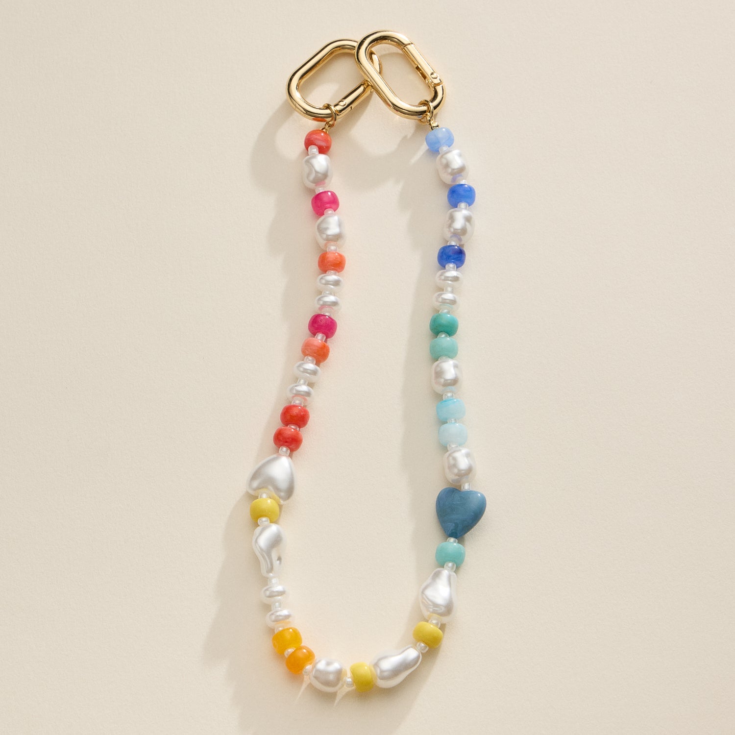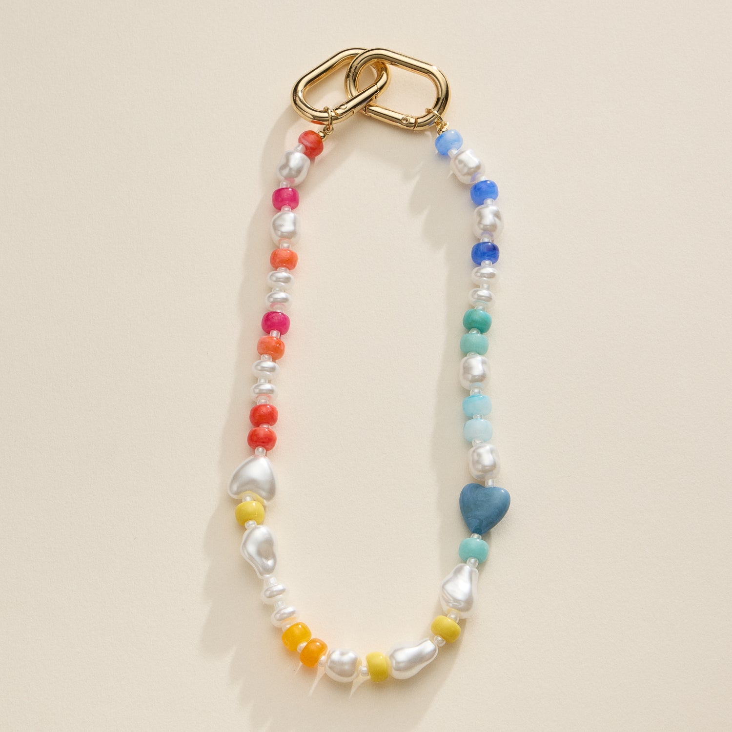 Add a unique touch to your bag with this colorful beaded charm featuring heart and pearl accents and a gold clasp. A fun and stylish accessory perfect for customizing handbags or keys. Shop now.