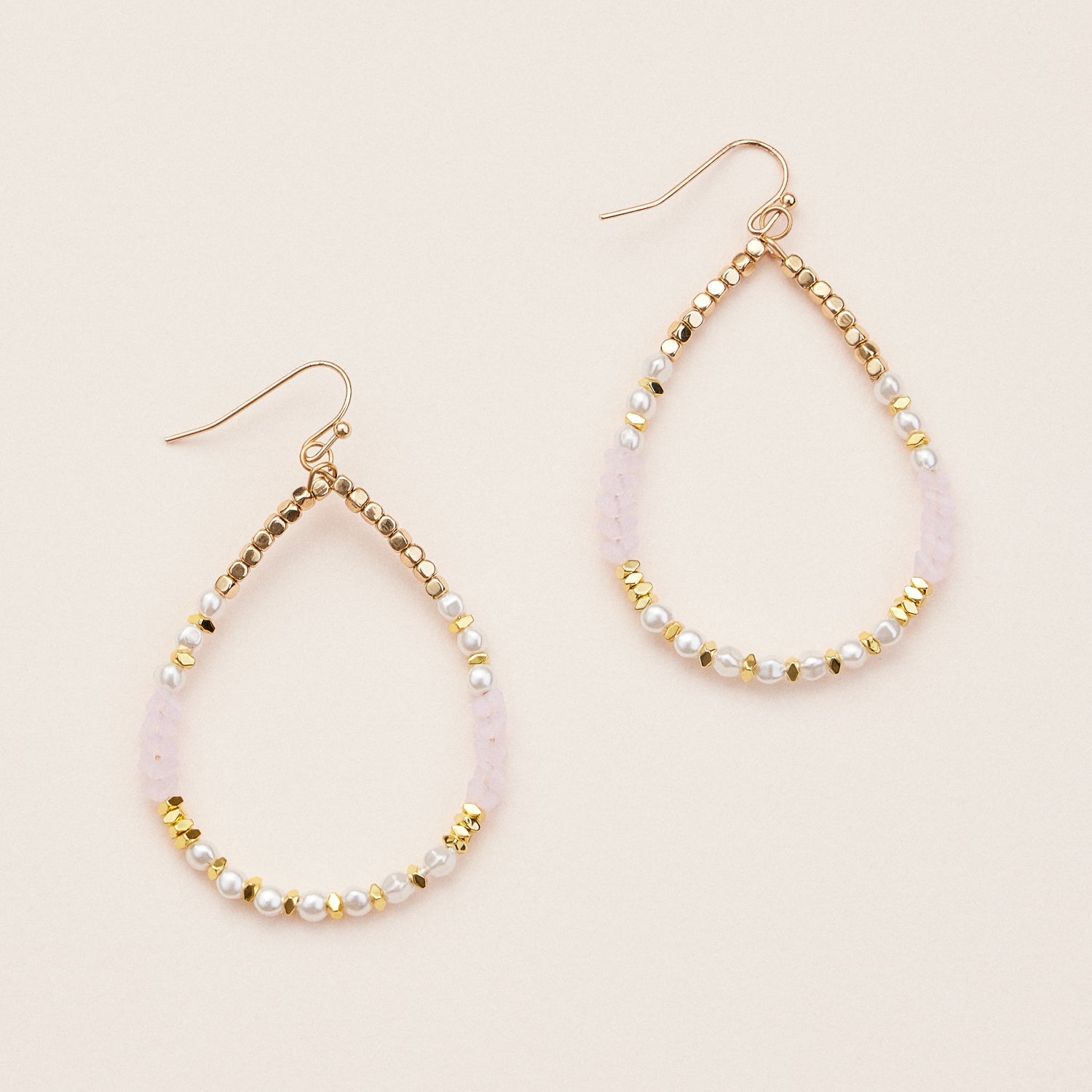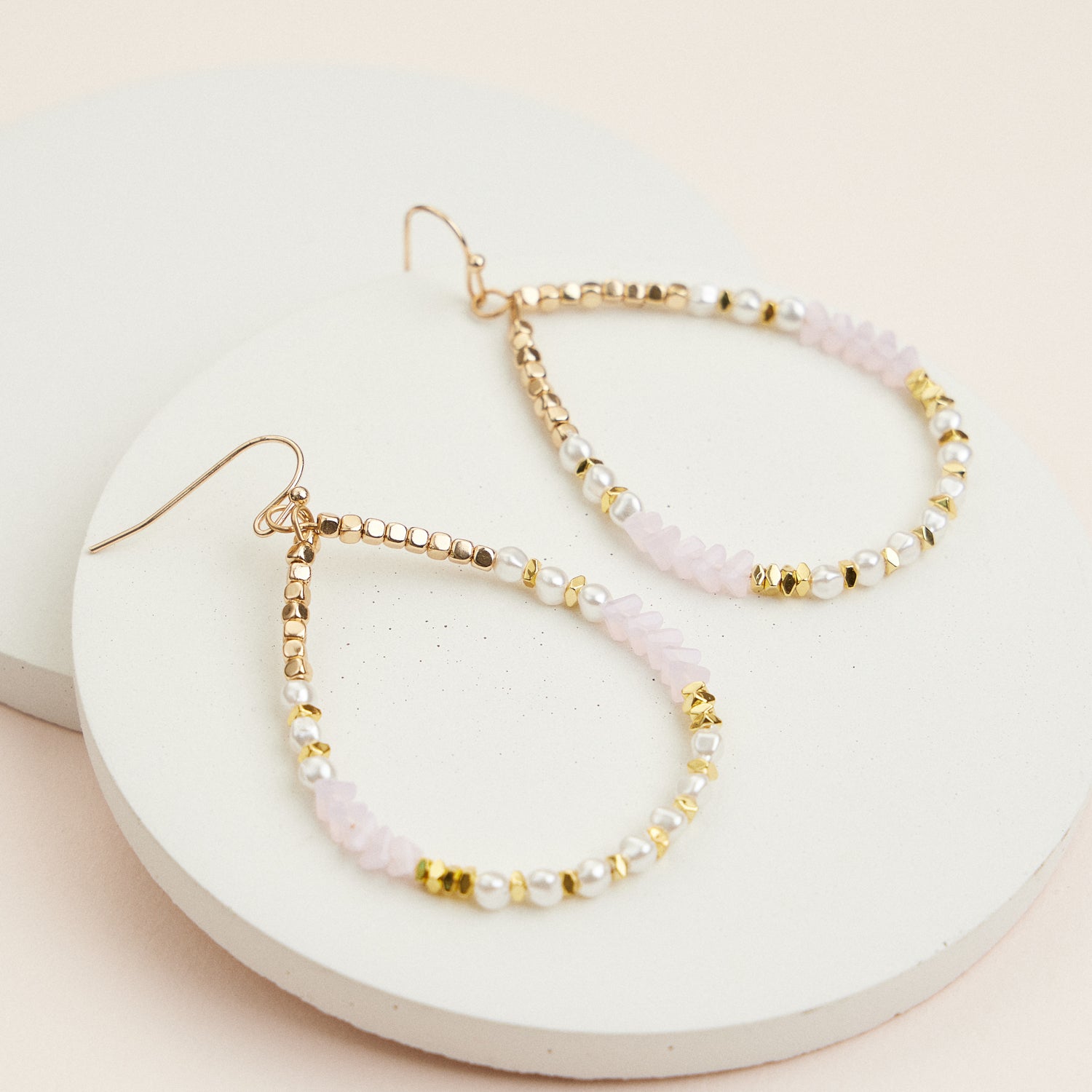 Elegant Teardrop Beaded Earrings – Rose Quartz, Pearl, and Gold Accent Jewelry