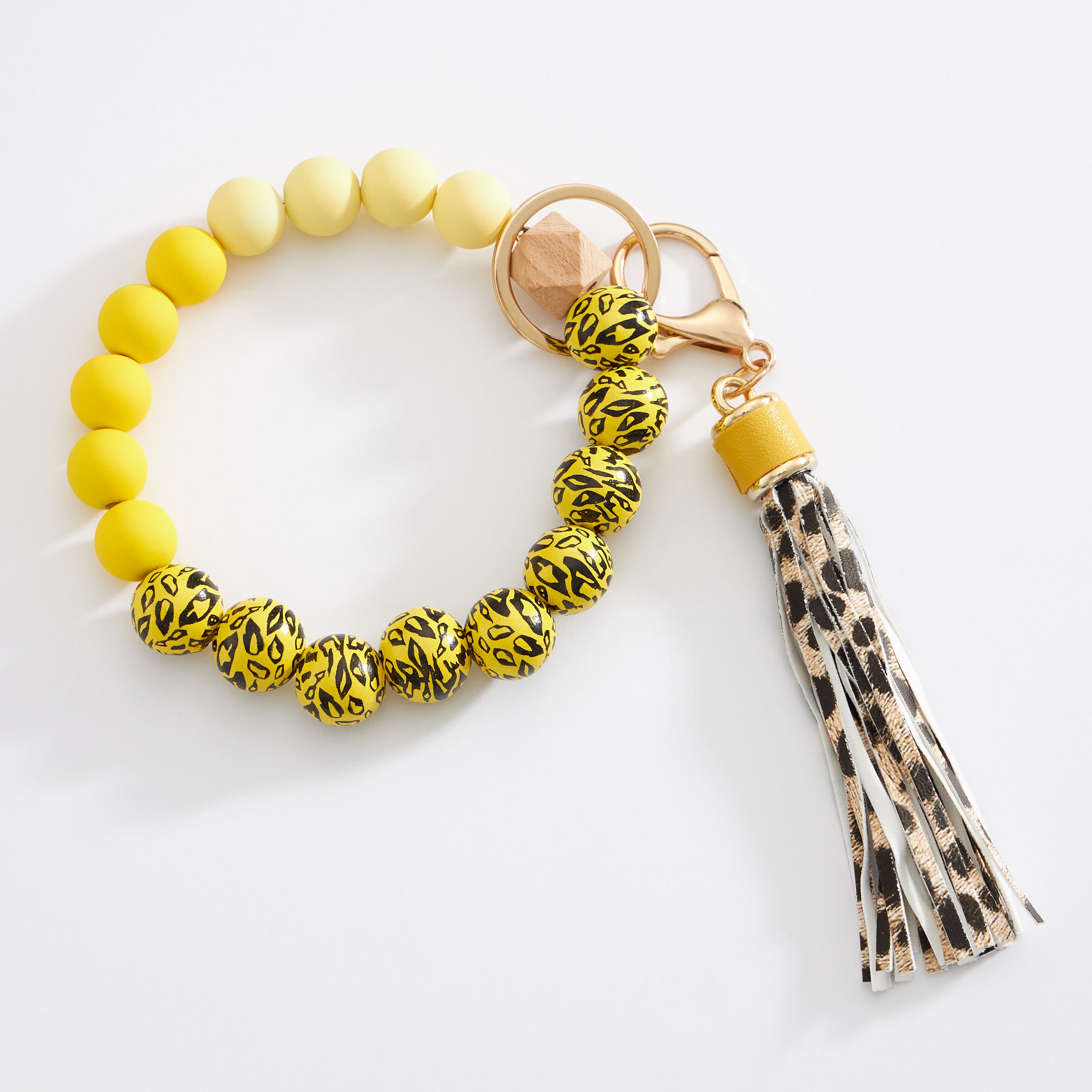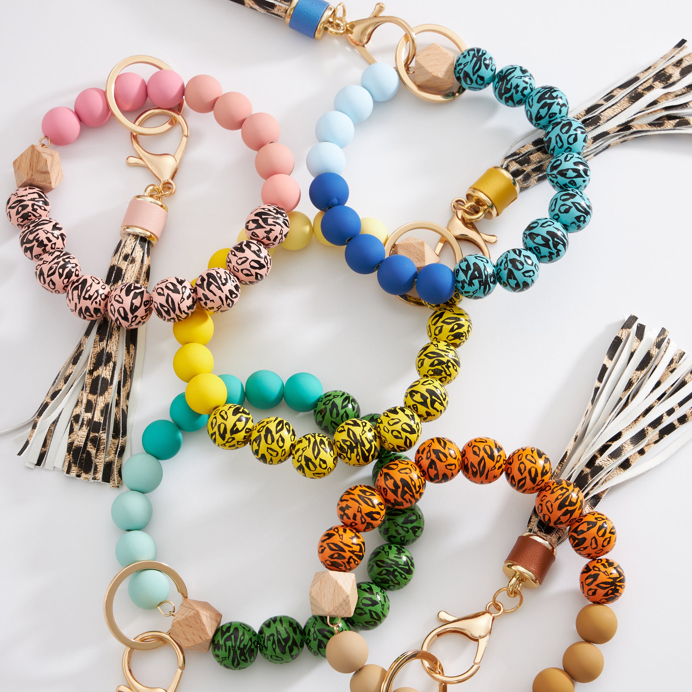 Make a bold statement with this colorful leopard beaded keychain bracelet, designed for fun, function, and fashion. Featuring vibrant silicone beads and wild leopard print accents, this bracelet keychain combines everyday convenience with eye-catching style. Complete with a chic faux leather tassel and gold-tone hardware, it easily slips on your wrist so your keys stay stylishly secure and hands-free.