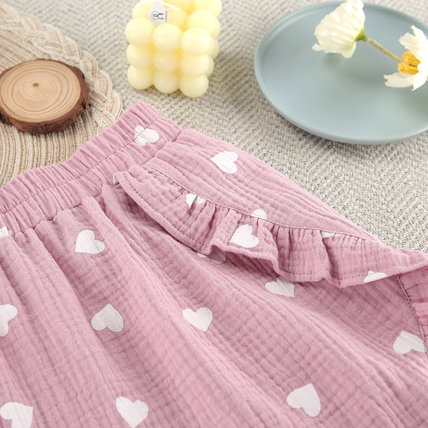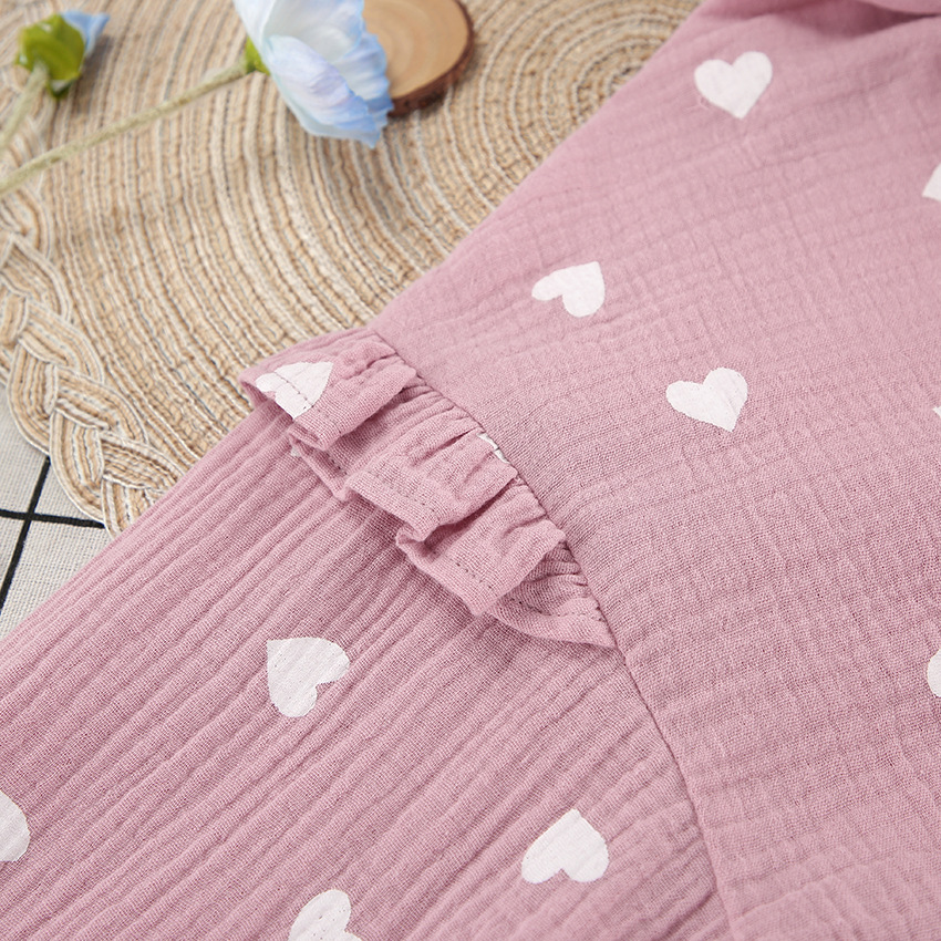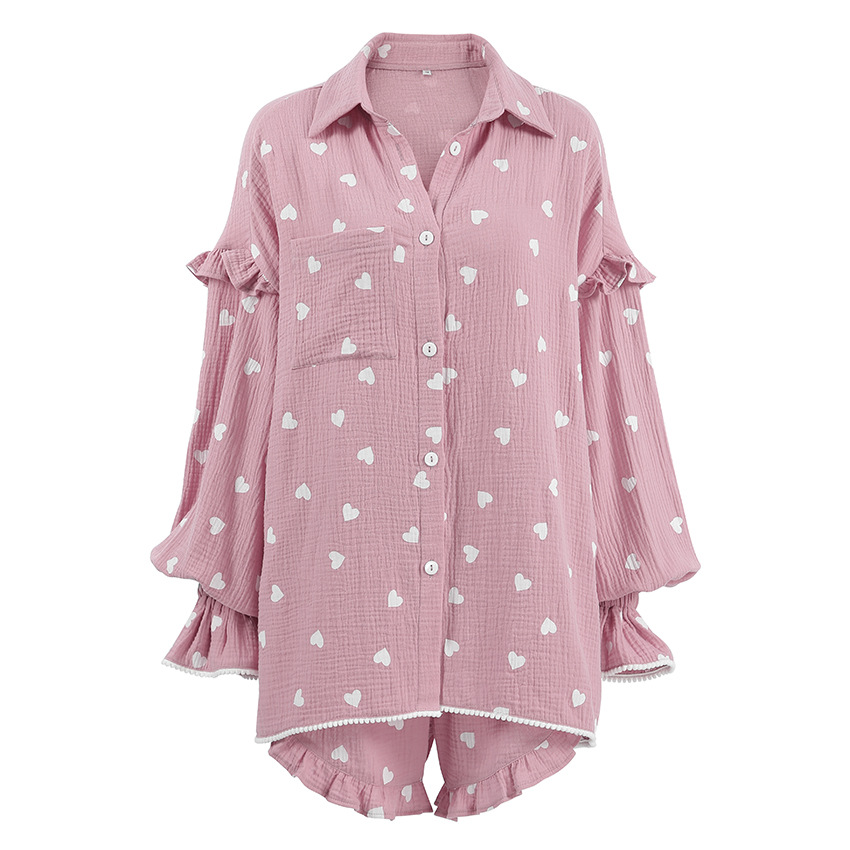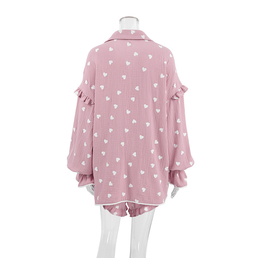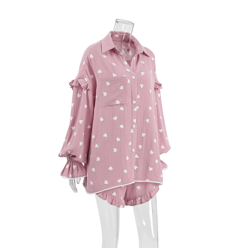 Upgrade your loungewear collection with this charming pajama set, featuring a delightful heart print and ruffled accents. The set includes a long-sleeve top and matching shorts, perfect for a cozy night's sleep or relaxing at home. Crafted from high-quality cotton, this ensemble ensures comfort and breathability for all-night wear.