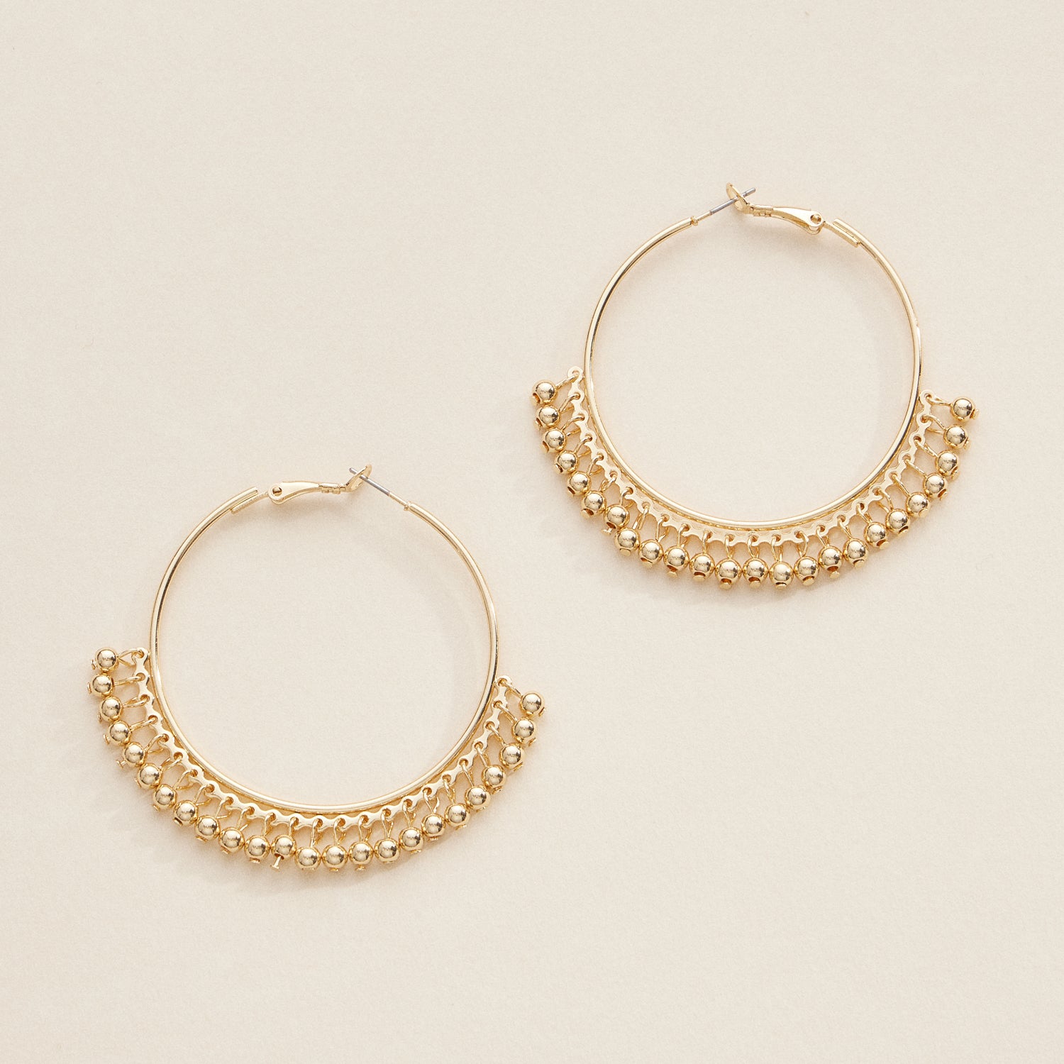 Elevate your style with these stunning hoop earrings, available in both silver and gold finishes. Featuring intricate beaded detailing along the lower edge, these hoops blend timeless elegance with a modern flair. Perfect for formal events or adding a touch of sophistication to your everyday outfits. Crafted from high-quality materials, these lightweight earrings are comfortable for all-day wear. An essential addition to your jewelry collection or a thoughtful gift for a loved one.
