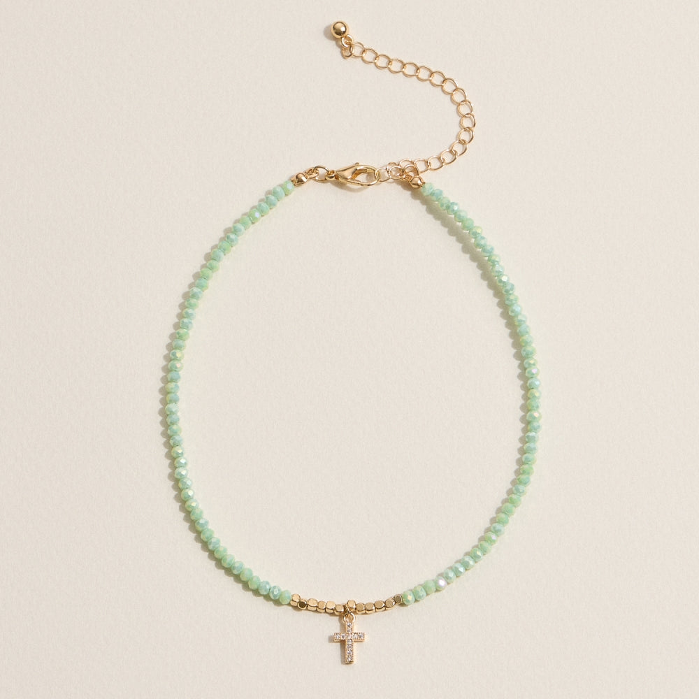 This faceted bead anklet features a delicate gold cross charm paired with shimmering glass beads for a subtle statement of faith. Finished with gold accents and an adjustable extender chain, it offers a comfortable and secure fit. Available in a variety of soft, versatile colors, this lightweight anklet is perfect for layering or wearing solo. A thoughtful option for gifts, religious occasions, or everyday style.
