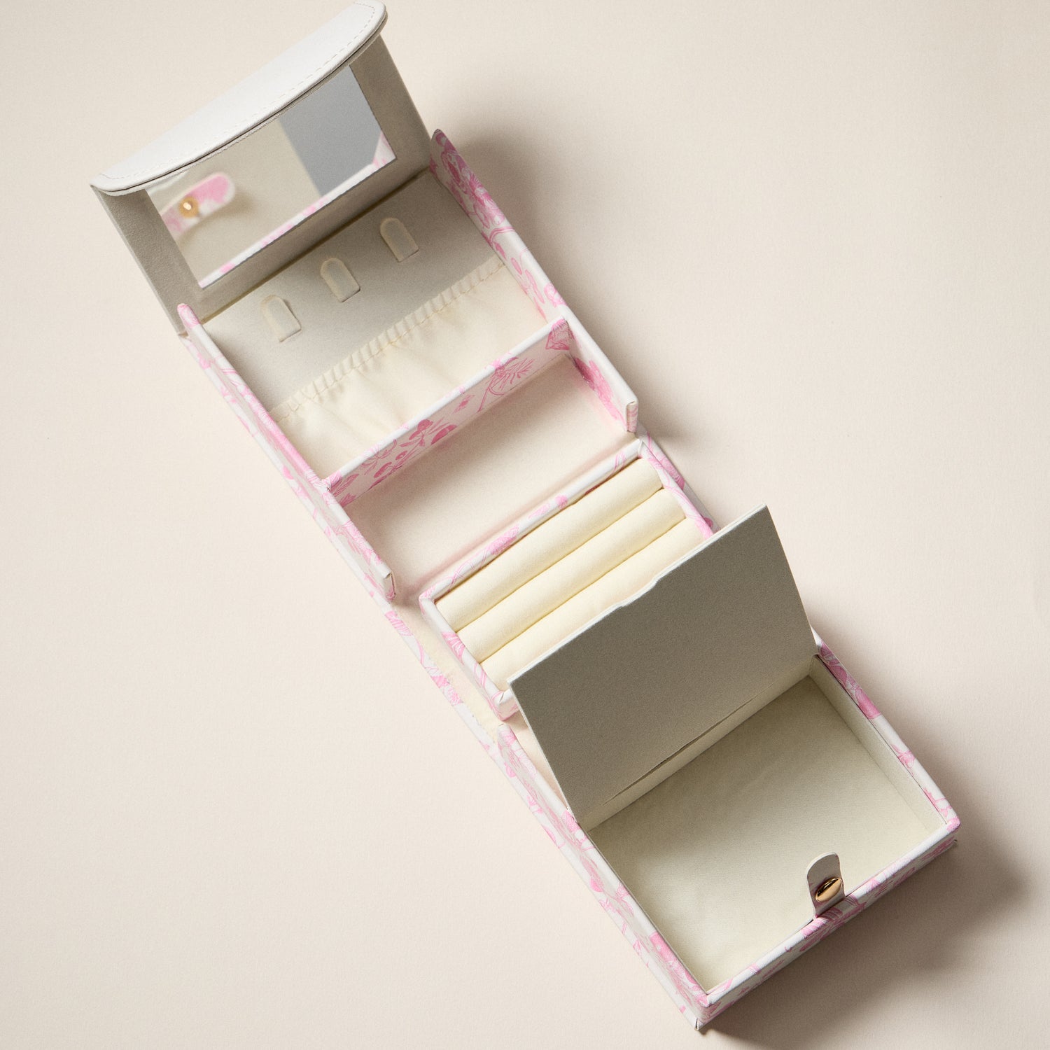 Delicate and undeniably romantic, this pink Regency-inspired jewelry organizer draws upon the timeless elegance of English floral toile. Rendered in soft blush tones against a cream backdrop, the design evokes the refined beauty of drawing rooms, garden promenades, and heirlooms passed gently from one generation to the next.