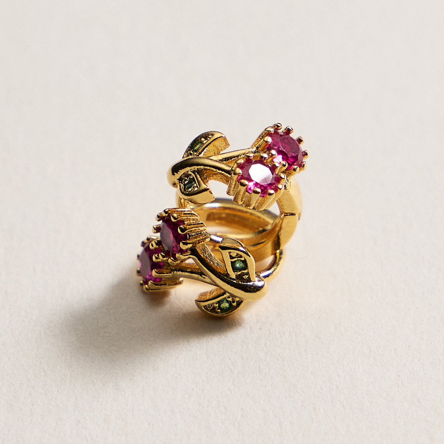 Keywords: gold-dipped flower earrings, Made in Korea jewelry, ruby and emerald stud earrings, floral gemstone earrings, vintage-inspired gold earrings, colorful stud earrings, Korean crafted gold jewelry.